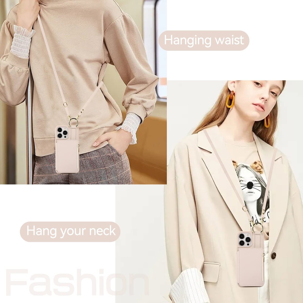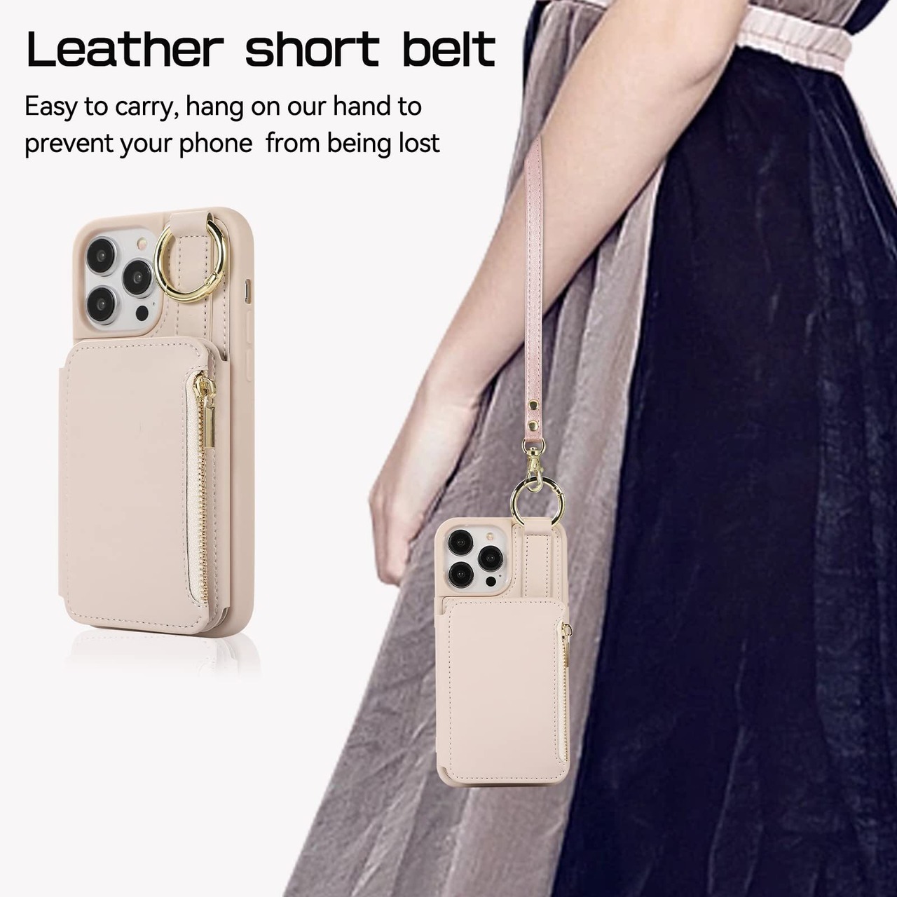 J.DL iPhone 13pro ストラップケース ショルダー 手帳型 PUレザー 肩掛け カード収納 斜め掛け スタンド アイホン 財布型 チェーン ファスナー型 ストラップ付き クロスボディ カード入れ スマホケース 携帯カバー 写真入りポケット ベージュ