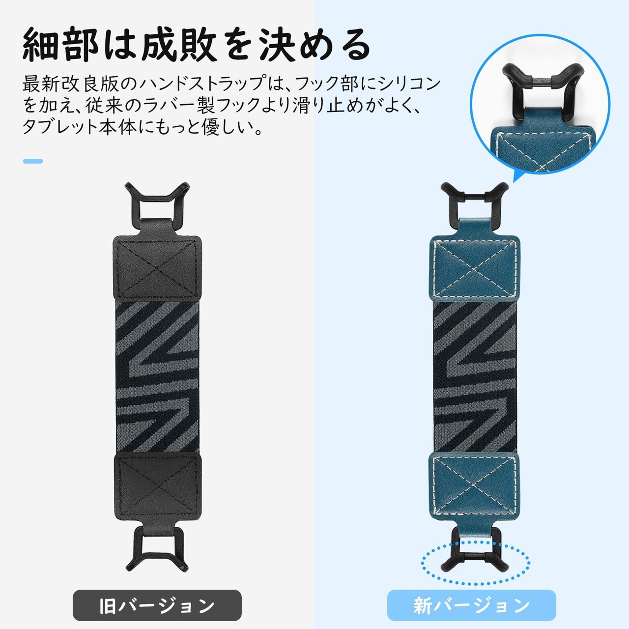 「上質素材採用」 優れた伸縮性がある弾力バンドを採用し、幅広い機種に対応でき、長時間使用しても緩みにくいです。上質なPUレザーを使用してフックの部分と丁寧に縫い合わせて、丈夫で引き裂けする心配は不要です。フックの部分は一定の靭性があるラバー素材を採用し、タブレットに取り付けても大切な端末に傷つきません。