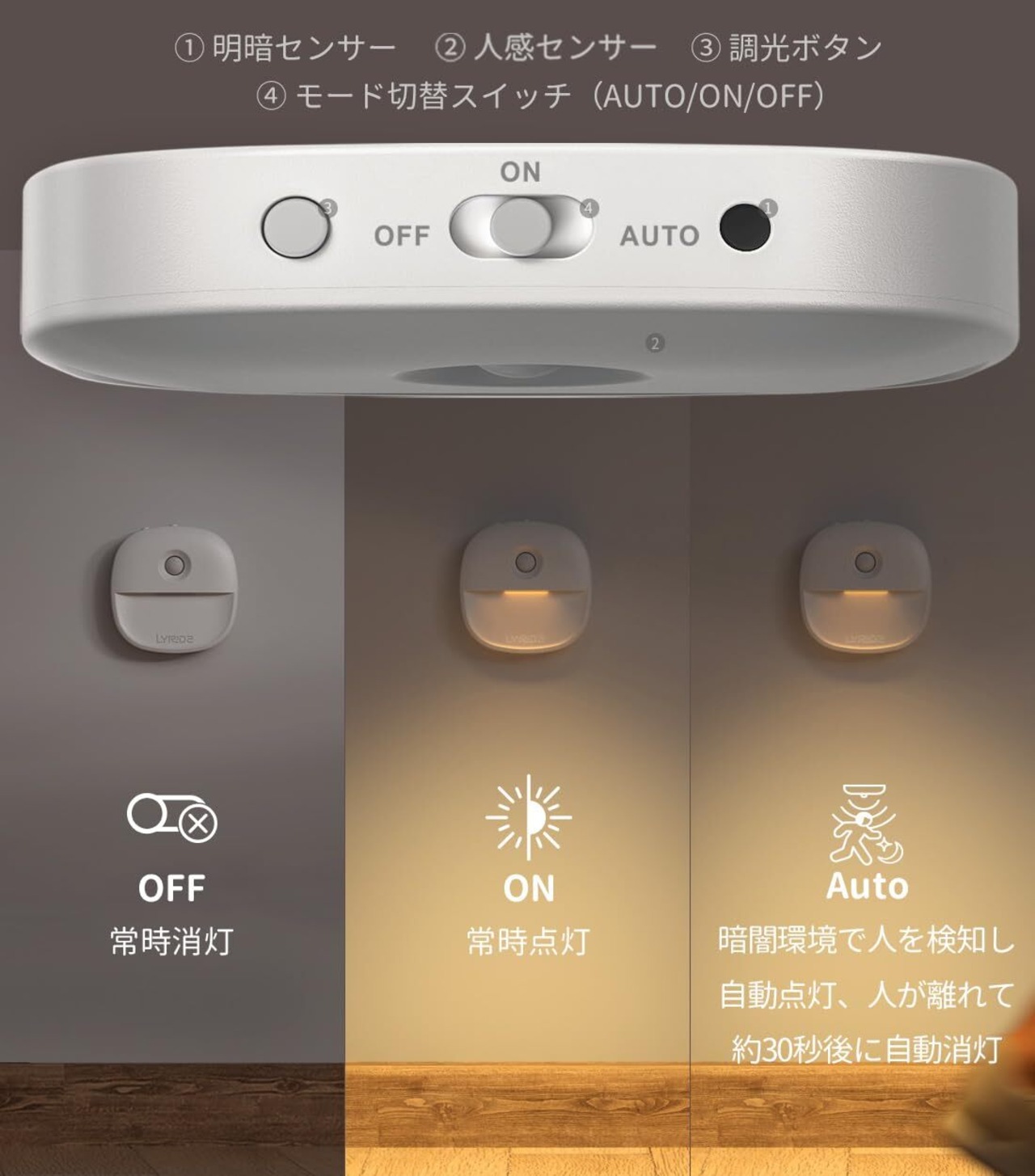 【三つの知能モード】LEDセンサーライトはON(常時点灯)・OFF(常時消灯)・AUTO(センサー)の切替スイッチがあります。ご都合によりモードを選べます。①AUTOモード:周囲が暗くなると明暗センサーが待機状態となり、人が来ると人感センサーが感知して自動点灯。離れて30秒後に自動消灯。感知範囲は120°、約4メートル以内です。②ONモード:常時点灯。緊急停電やクロゼットに物を探す時、持続点灯する常夜灯として使えます。③OFFモード:旅行でしばらく必要がない時に便利なモード。