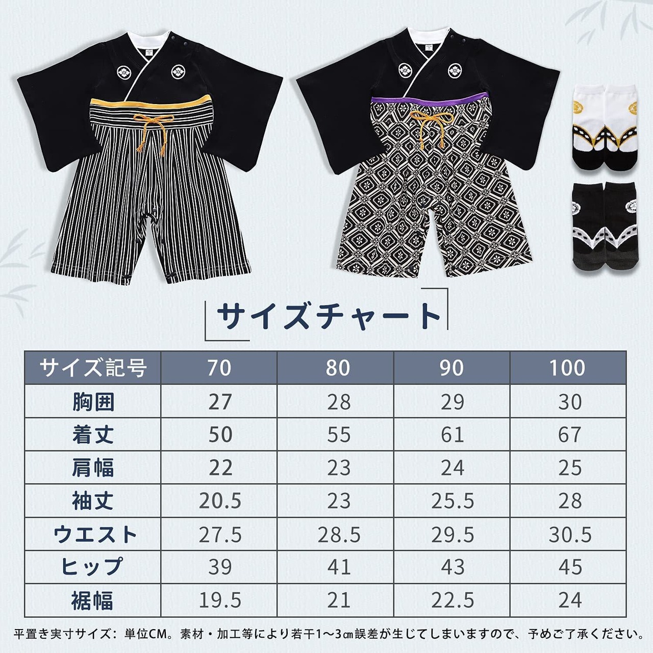 【セットのサイズ展開】袴ロンパース*1+ 靴下*2、70㎝/9-12㎝、80㎝/9-12㎝、90㎝/12-15㎝、100㎝/12-15㎝(詳細な寸法は商品の説明に参考してください。)ゆったりしているので、普段着感覚で楽しめます
