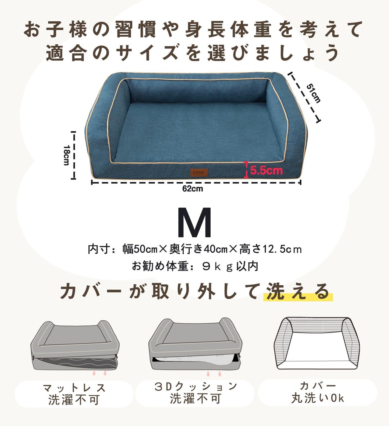 EMME 犬 ベッド 清掃しやすい 防水 ペットベッド ペットソファー 犬用ベッド 洗える さらさら 通気性 蒸れにくい ペットクッション 枕付き クッション性が 高反発 高齢犬 子犬 猫 多頭飼い 取り外せるカバー 滑り止め オールシーズン 中型犬 大型犬 洗える ペット用ベッド62x51x18cm ブルー Mサイズ