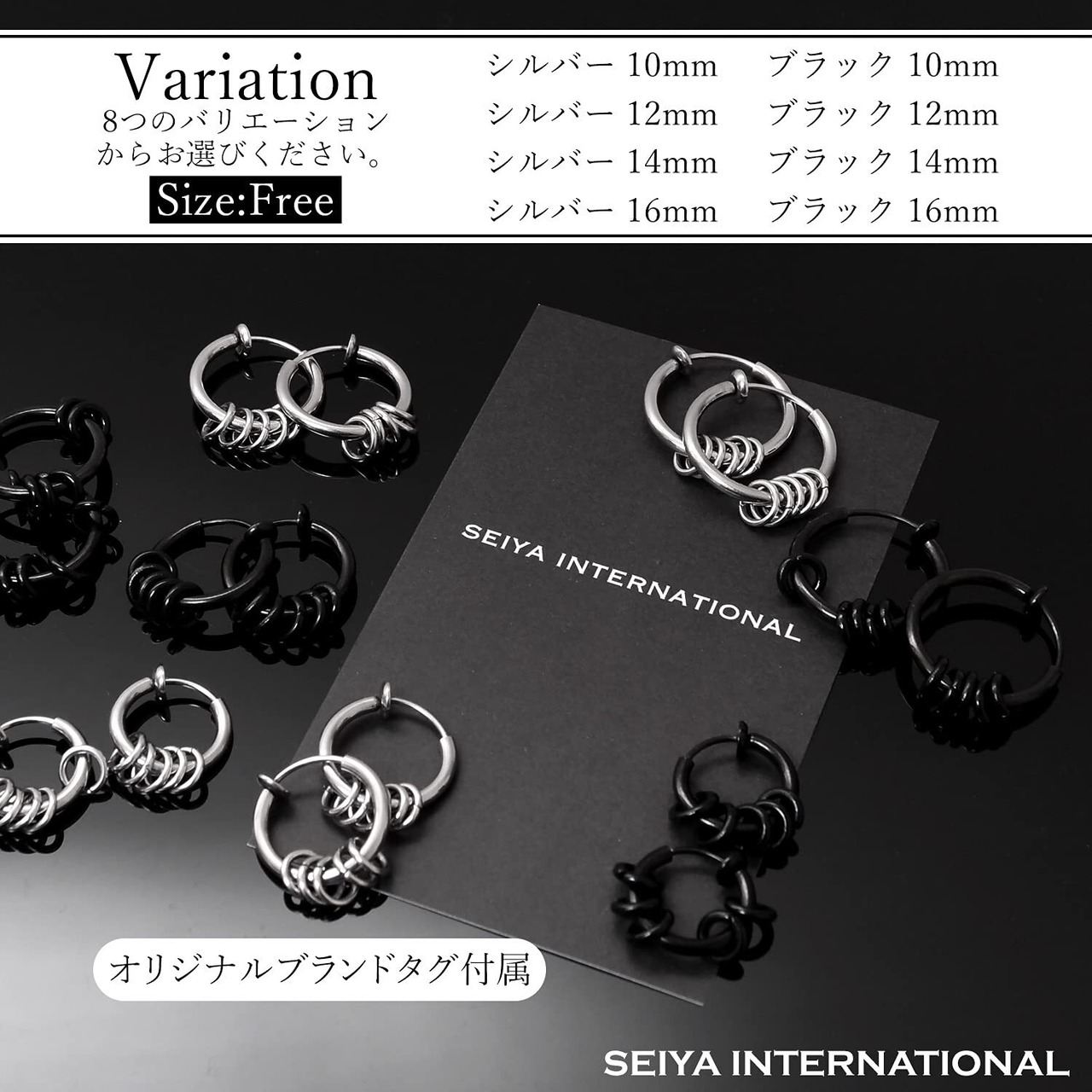 【 選べるカラー・サイズ 】フープイヤリングのサイズは内径10mm・12mm・14mm・16mm (外径14.5mm・16.5mm・17.5mm・20mm)、カラーはシルバー・ブラックの2色をご用意しました。フープイヤリングの厚さは約1.8mmになります。フープのサイズはわっかの直径が大きいほど存在感があり、カジュアルな印象を与えます。シンプルなコーディネートに華やかな雰囲気を加えたい時は、直径の大きなフェイクピアスがおすすめです。一方、わっかの直径が小さいほど上品で落ち着いた印象になります。シックにまとめたい時やビジネススタイルに合わせる時には直径が小さなフェイクピアスがおすすめです。ブラックのフェイクピアスはクールな雰囲気に仕上がります。シルバーのフェイクピアスは、洗練された落ち着きのある印象に仕上げたい時におすすめ。シルバーの輝きはコーディネートをすっきりと魅せてくれます。
