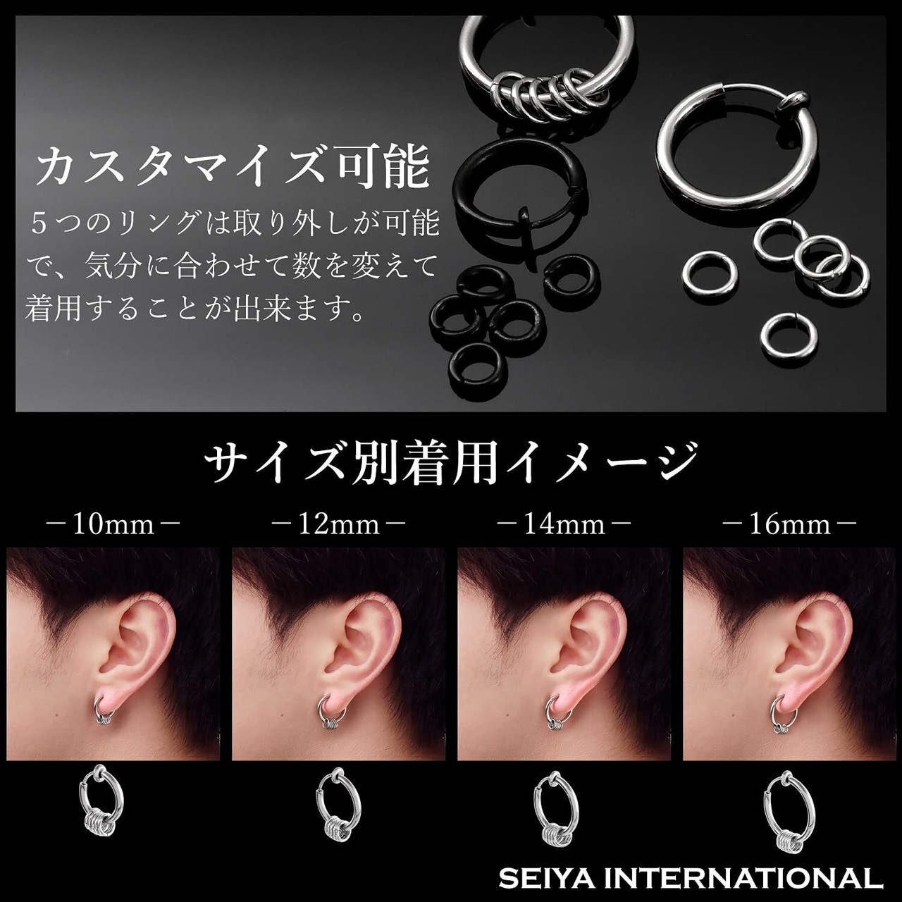[SEIYA INTERNATIONAL] フェイクピアス メンズ レディース イヤリング ノンホールピアス イヤーカフ 5連リング ブラック 両耳セット (14mm, シルバー)