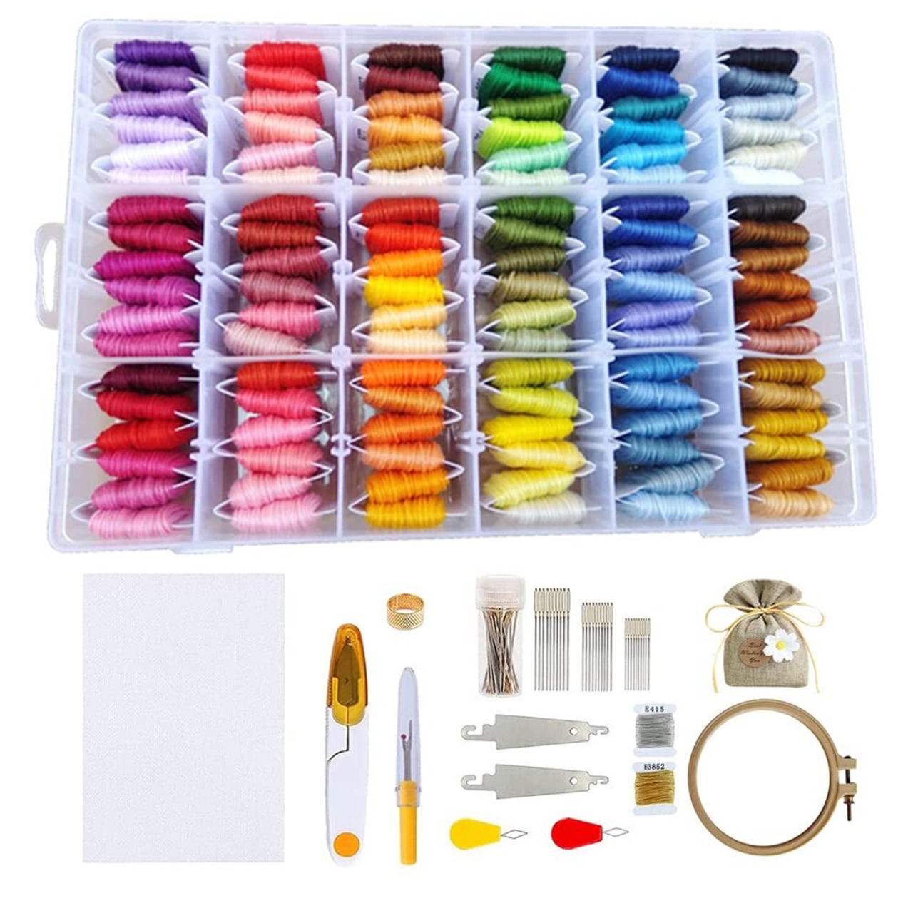 【刺しゅうキット内容】刺繍糸108色セット、ししゅう布1枚、刺繍枠1個(内径約12cm、プラチック)、刺繍針30本3種類、糸切りハサミ1個、指ぬき1個、糸通し4個2種類、リッパー1個、おしゃれな福袋おまけ1個、刺繍糸専門収納ケース1個 豊富なカラーの刺しゅう糸セットです。