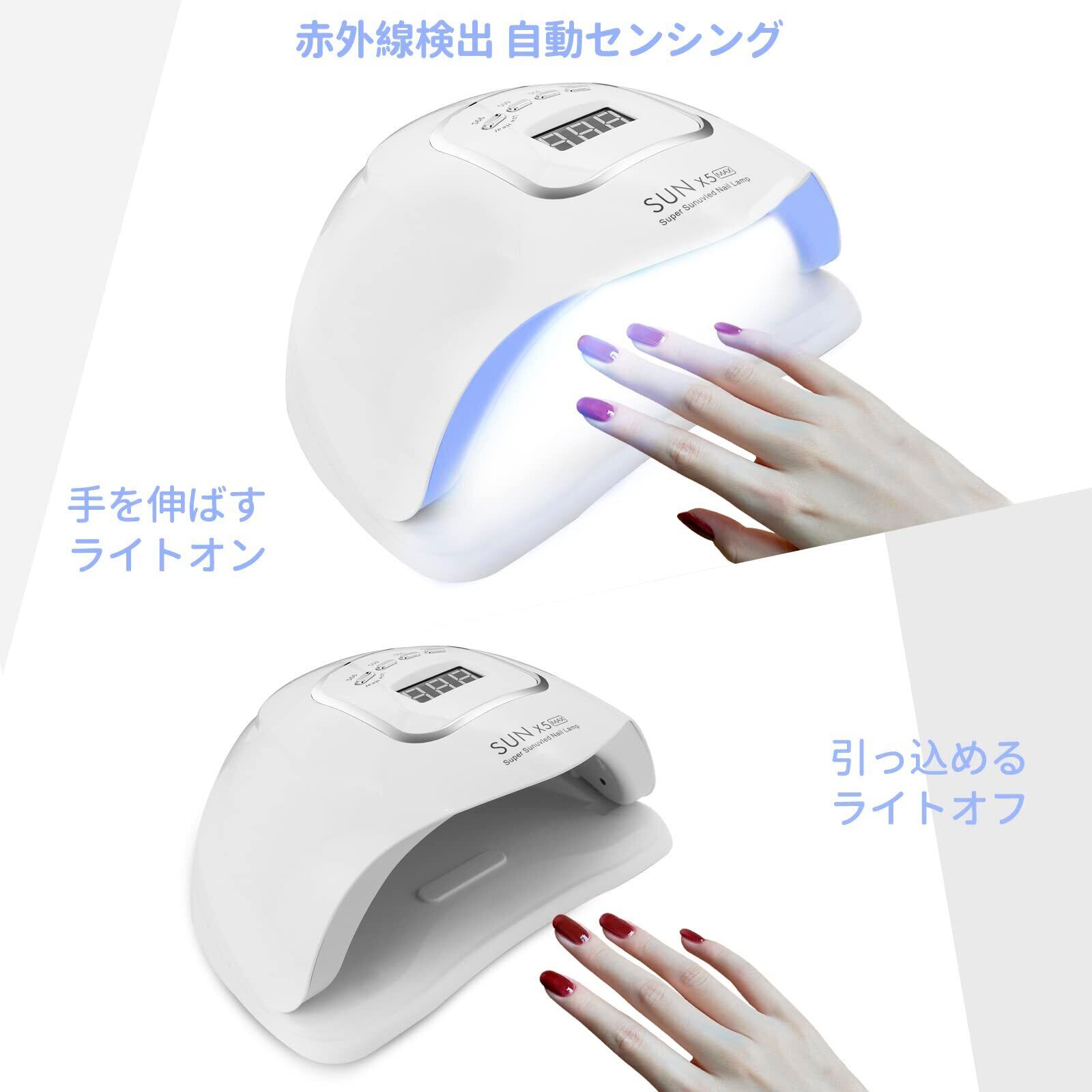 【自動センサー&4段階タイマー表示】赤外線検出システムを搭載し、指先/足を感知すると自動的にセンサーがオンになります。手を離すと、ライトは自動的にオフになります。10秒/30秒/60秒/99秒(弱火モード)の時間設定が可能なジェルネイルライトです。