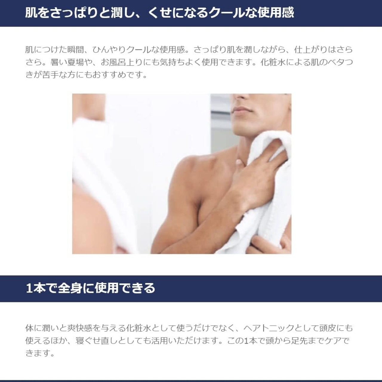 【肌をさっぱりと潤し、くせになるクールな使用感】肌につけた瞬間、ひんやりクールな使用感。さっぱり肌を潤しながら、仕上がりはさらさら。暑い夏場や、お風呂上りにも気持ちよく使用できます。化粧水による肌のベタつきが苦手な方にもおすすめです。