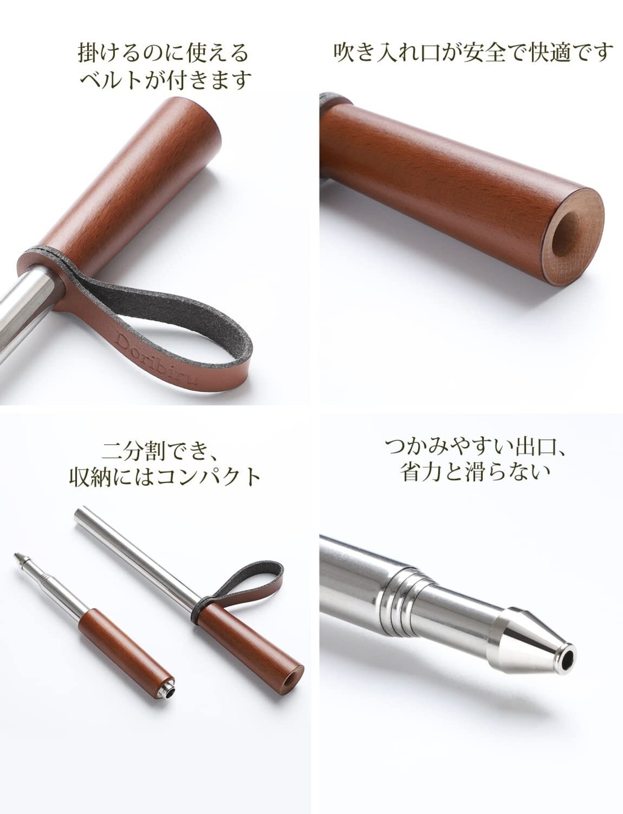 【ほかのお選べられるポイント】①パイプは錆びにくく、変形しにくいSUS304ステンレスを採用しているので、長く使っても安心。②特別に設計された空気の出口は、パイプを伸びる時に滑られにくい。③お洒落な革製ストラップが付き、ハンガーなどに掛けると便利です。④専用の収納袋が付属、火打ち石などほかの小物も一緒に入て保管可能です。