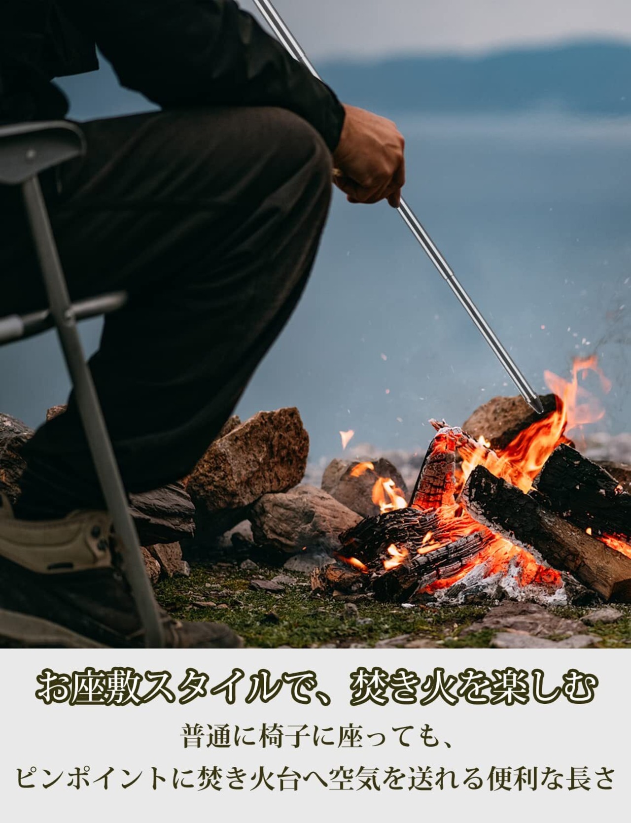 【キャンプファイヤーに大切なパートナー】キャンプの場合にチェアに座っても、ピンポイントに空気を炭火や薪までに送れる超長い火吹き棒です。吹き入り口、グリップも天然木を採用していることで、断熱と同時にキャンパーが周囲の環境によりよく溶け込むように、焚き火の雰囲気をより一層高めてくれます。