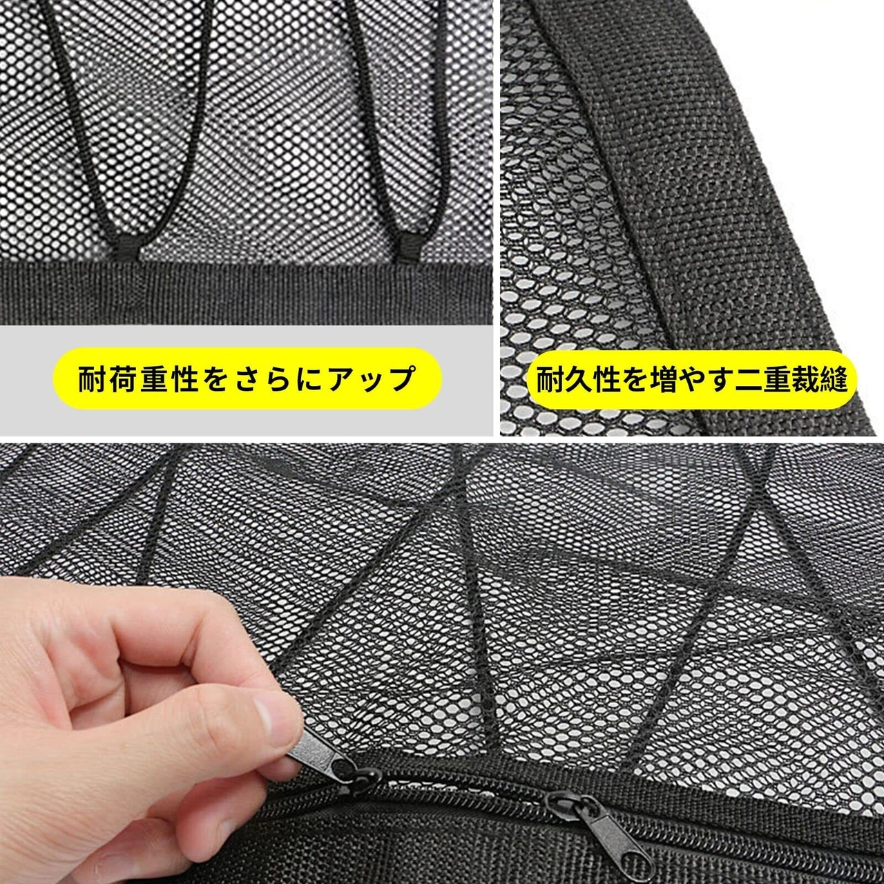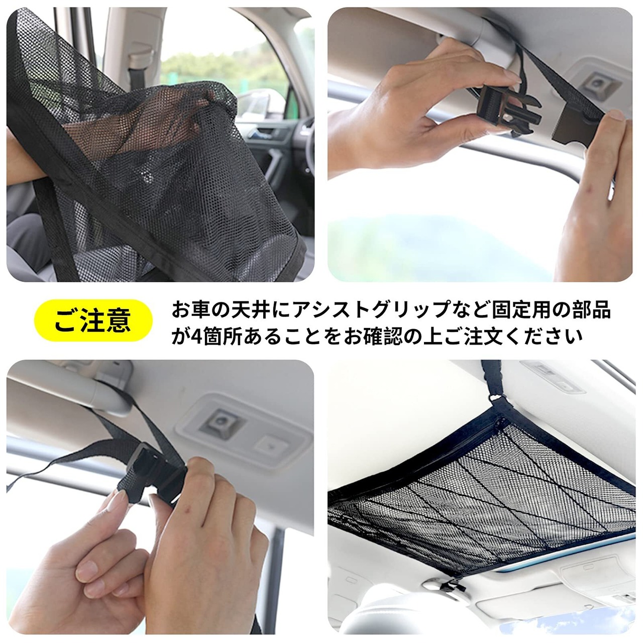 ■【幅広い適用車種】:従来の天井ネットを改良して、二重ネット構造を採用し、安定性、耐荷重性をさらにアップグレードして、荷物をネットの上に置けることではなく、ネット内に置くことも可能で運転により荷物の転がることを防止します。車内に固定用のアシストグリップ等4箇所があれば適合可能です。