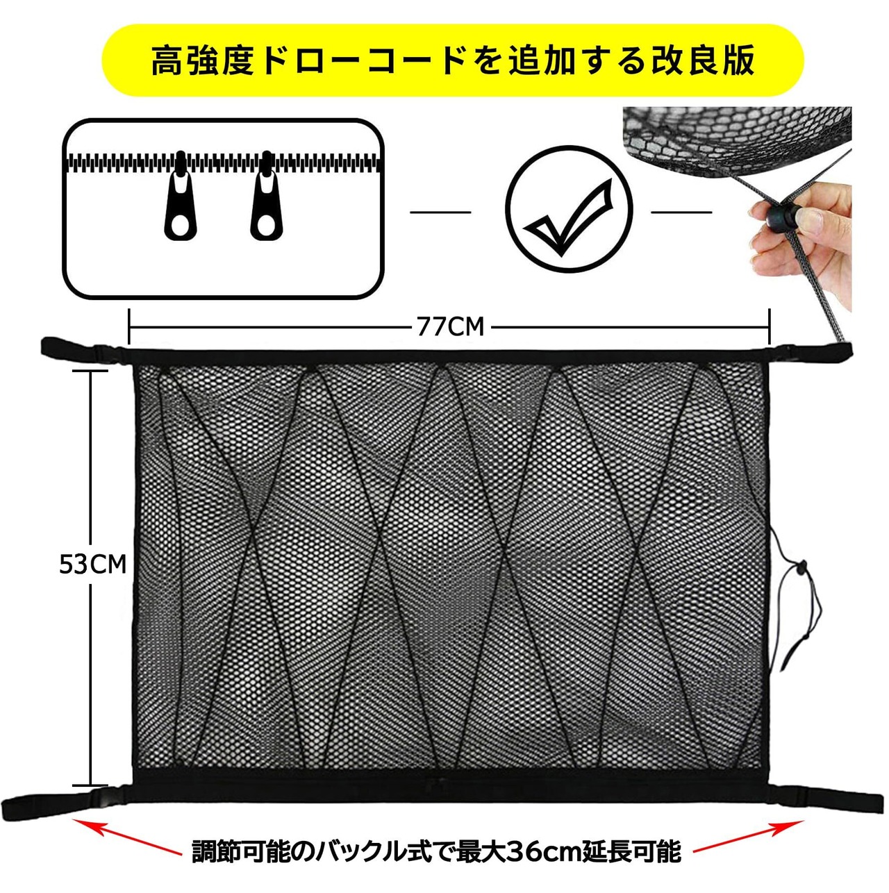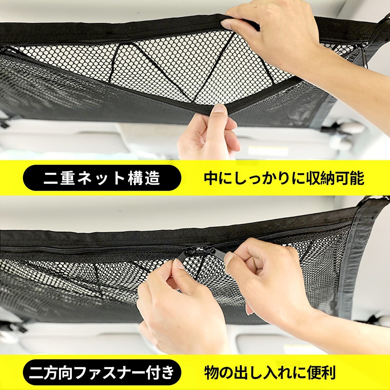 ■サイズ:77cmx53cm ご注意:車内に四角固定用のアシストグリップ等があることをお確認ください。荷物が多い場合に天井スペースを有効に活用出来るダブルファスナー式の天井収納ネットです。開口が大きくて、荷物の出し入れに邪魔なし!念のため、重い物、尖った物や鋭利な物を置かないでください。