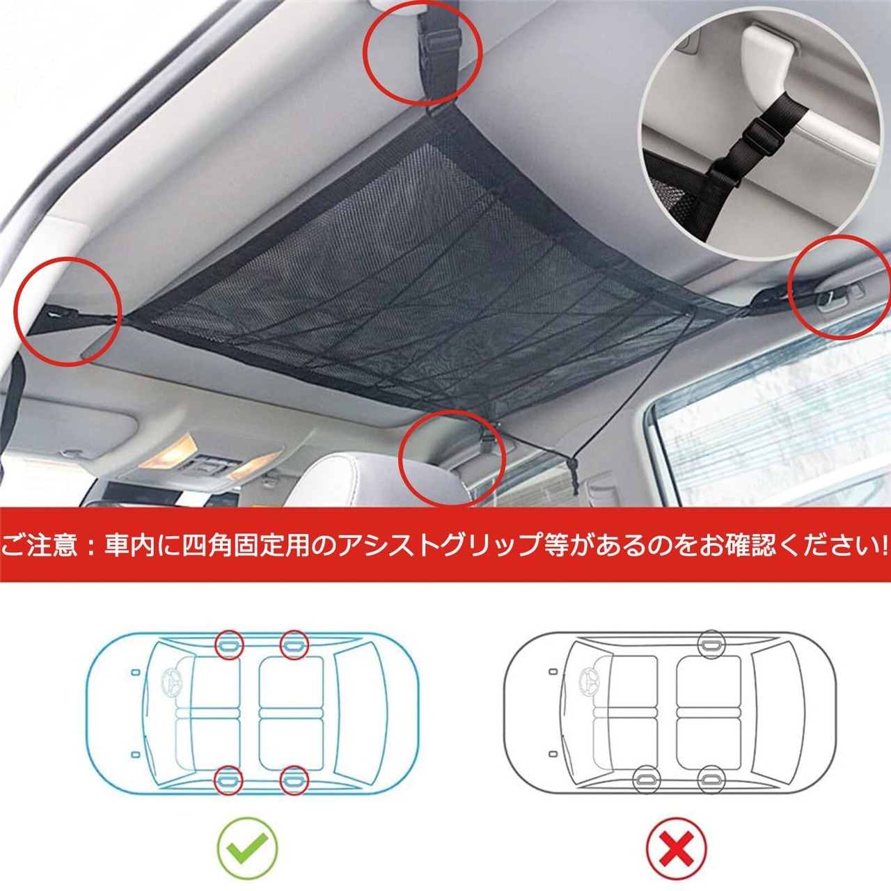 ■【取り付けが楽】:天井ネットの四隅の固定式バックルで、車内にある四角固定のアシストグリップ等から通して、バックルで固定できます。ネットの長さは調整可能で、カーゴネットに荷物を置いても垂れ下がらないためにしっかり締めてください。