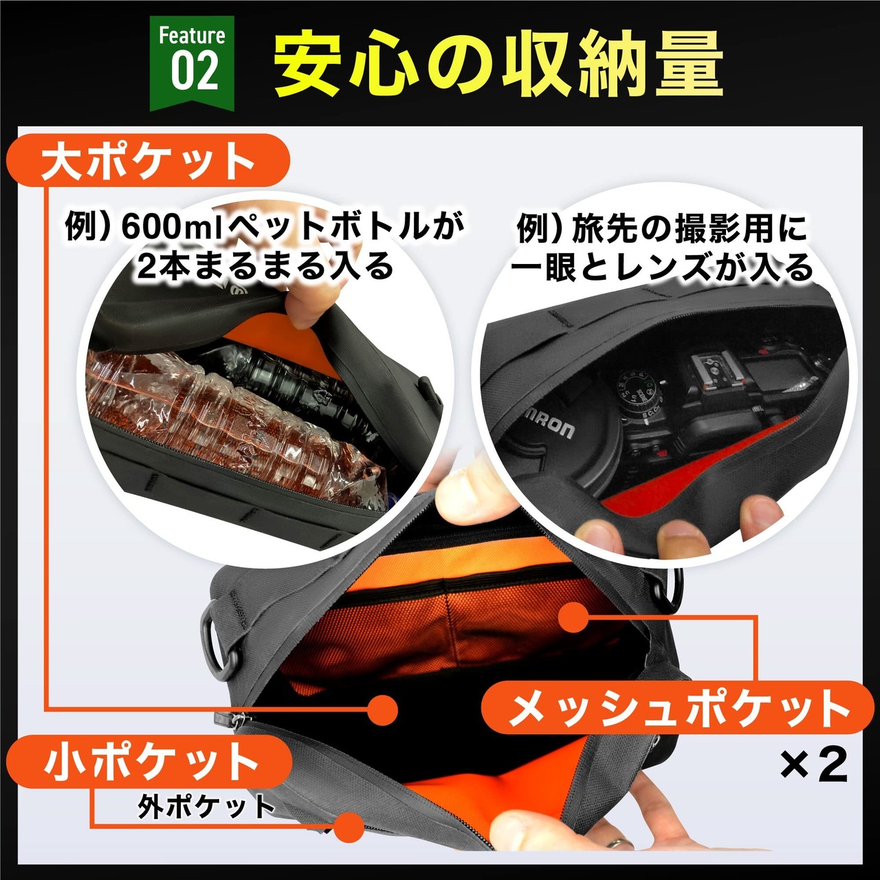 【大容量で驚き!】一眼レフカメラのボディとレンズが収納でき、ペットボトル2本も楽々入る!さらに、小物の収納スペースも完備されており、ロードバイクでの旅にぴったりのフロントバッグです。サドルバッグやトップチューブバッグと併用して、必要な物を全て持ち運べます。