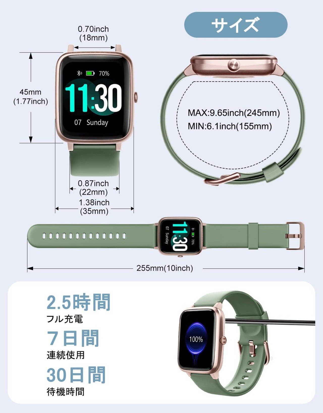【多種言語設定・大容量電池】スマートウォッチを日本語、英語、韓国語などに設定することができます。 初回ご使用時に日本語取扱説明書をご用意しております。300mAhの大容量バッテリーを内蔵し、2.5時間でフル充電できます。フル充電で一度に5~7日間使用でき、待機時間は最大30日間可能です。(バッテリー持続時間は使用頻度により異なります。)