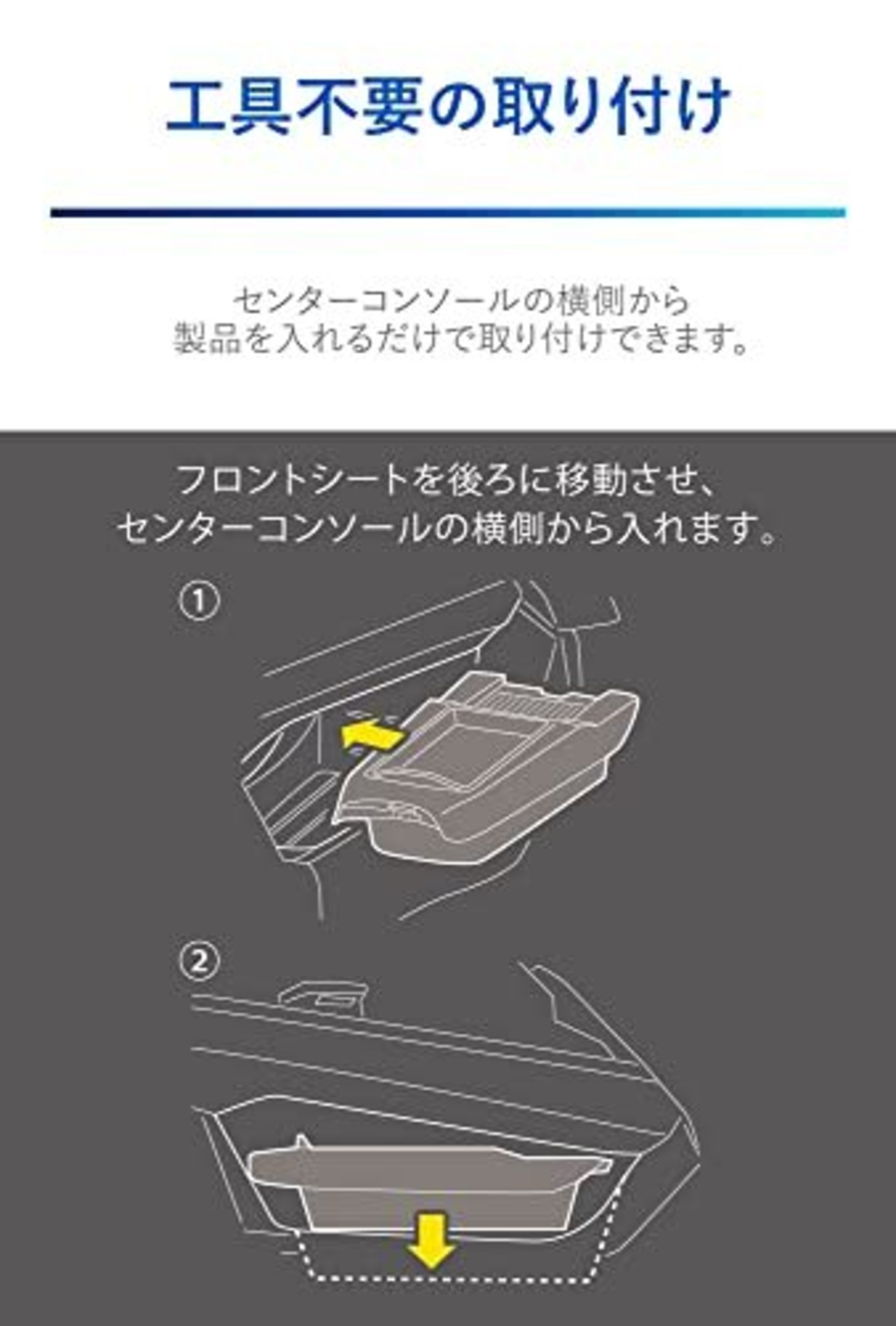 【工具不要で簡単な取り付け】フロントシートを後ろに移動させ、センターコンソールの横側から製品を入れるだけで取り付けできます。製品底面にはスポンジシートを備え、製品のがたつきを防止します。走行中のがたつきやカタカタ音を防ぎ、快適に過ごせます。