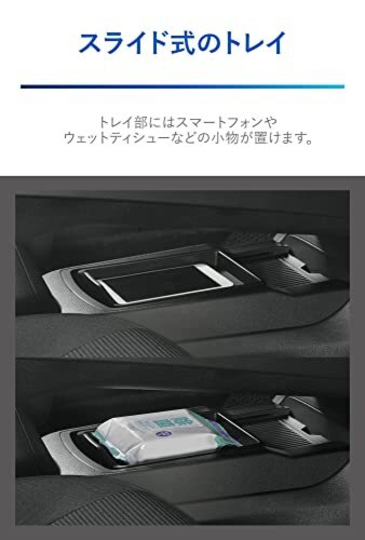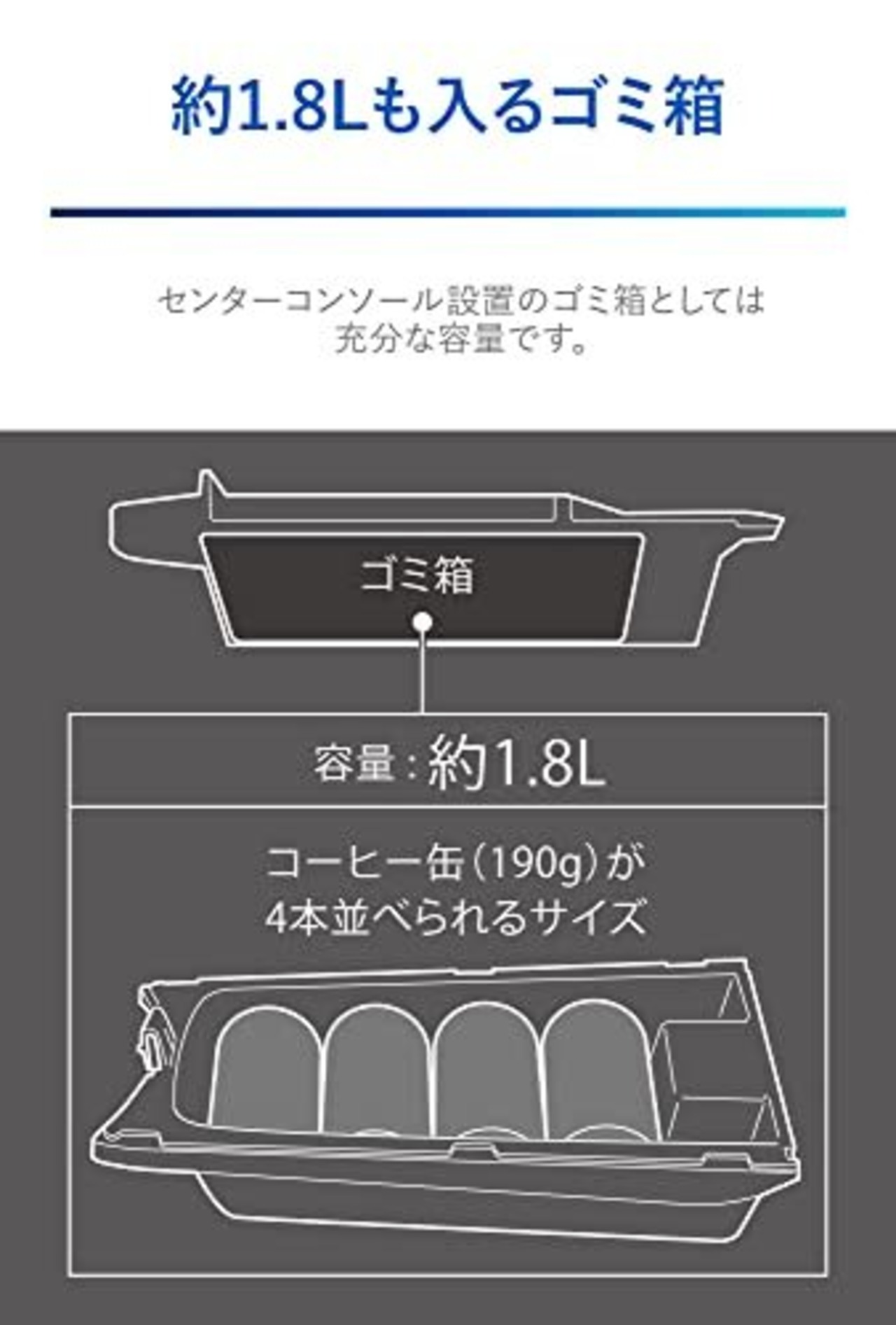 【小物が置けるトレイ】スライド式のトレイはスマートフォンやウェットティシューなどの小物が置けます。コンソール下に小物が置けるため、運転席や助手席から手が届きやすく取り出しやすいです。ゴミ箱の容量は約1.8Lです。(190gコーヒー缶が4本並べられる大きさ)コンソール下のHDMI端子(オプション装備)にコードを挿した状態でも本製品を使用できます