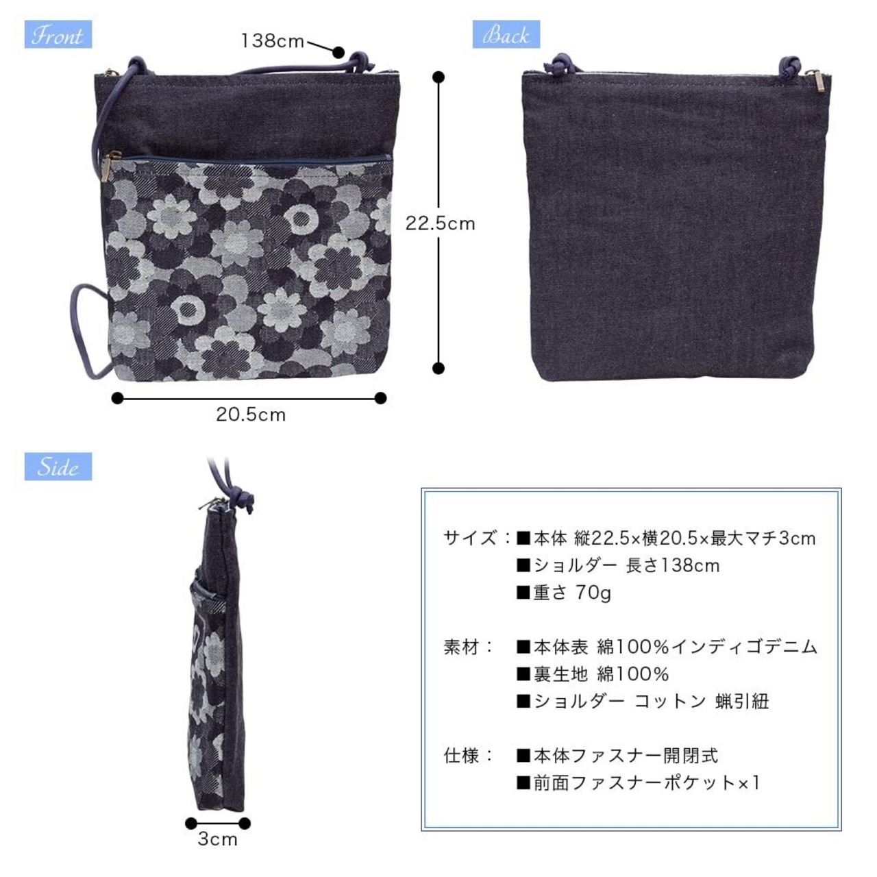 [creareきき] ポシェット レディース 斜めがけ 小さめ 軽量 日本製 岡山デニム 軽量ミニショルダー 2ファスナー 母の日 お母さん 誕生日 プレゼント DJ-111m (ブルー)