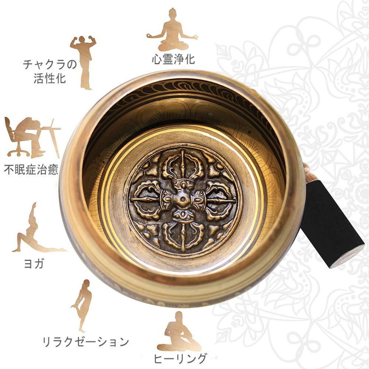 【初心者向け】 扱い易く丁度良いサイズ(口径11cm、高さ5cm)で、手で持てる可能、鳴らし方は棒でふちをこするだけの簡単な動作だけ。スティックが触れるフチの部分はフラットにして、鳴らしやすさも抜群です。羊の革に包まれた心棒、座布団、2層麻製の収納用袋が付属され、携帯に便利な歌うボウルセットです。