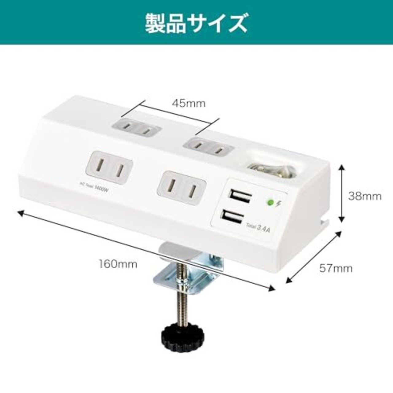 エルパ(ELPA) 卓上電源タップ USB付き クランプ固定 集中スイッチ 雷ガード付き WLS-DS4232SUA(W)