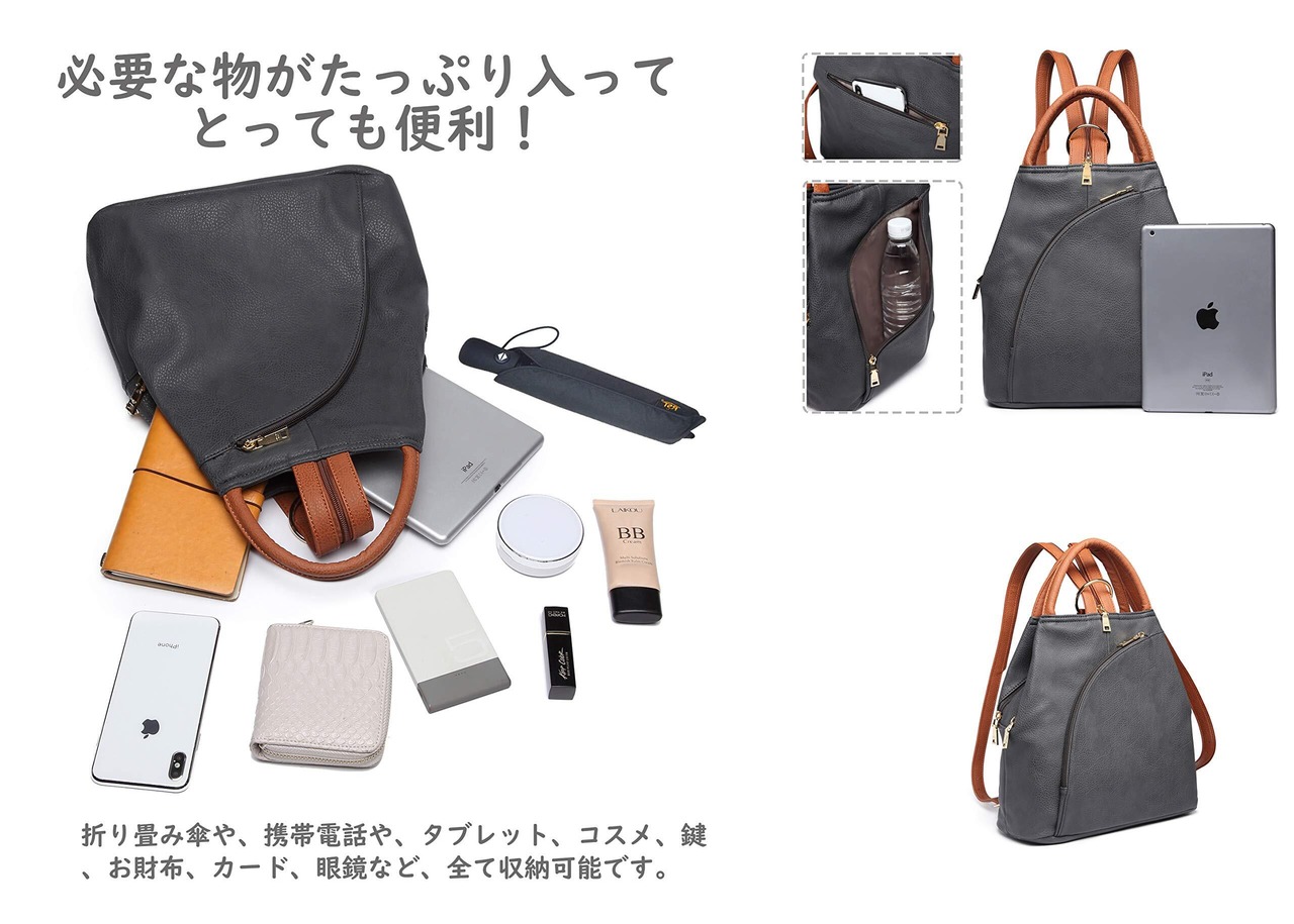 手提げ、ショルダーの使い分けでボディバッグとリュック、3通りに使えるアイデアバッグ①カジュアルテイストにもフェミニンテイストにも合わせられ、幅広いコーディネートに活躍!②デザインだけではなく、機能性も兼ねそろえたGOODなバッグです③スタイリッシュな縦長フォルムで、女性らしい円滑なファスナーポッケデザインです。④カッコよさと可愛らしさの両方を実現⑤レザータッチ素材で、柔らかさと軽さが魅力のバッグです!⑥内側と背面にはポケットがついているので小振りですが荷物を分けて収納できます。