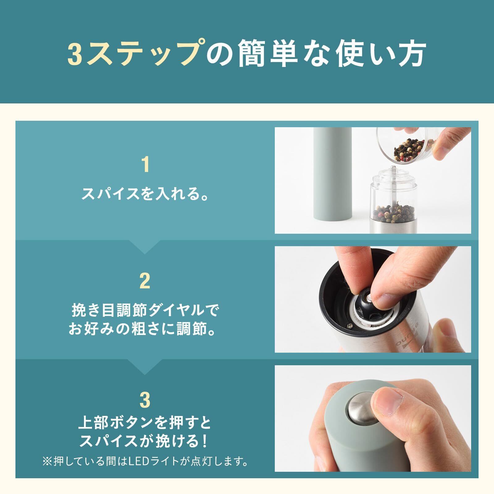 BRUNO ブルーノ 電動ミル 岩塩 ホールペッパー 胡椒 スパイス 粗さ調節可能 ドレッシング 作り パーティー ギフト プレゼント LEDライト付スパイスミル ホワイト 白 BHK223-WH