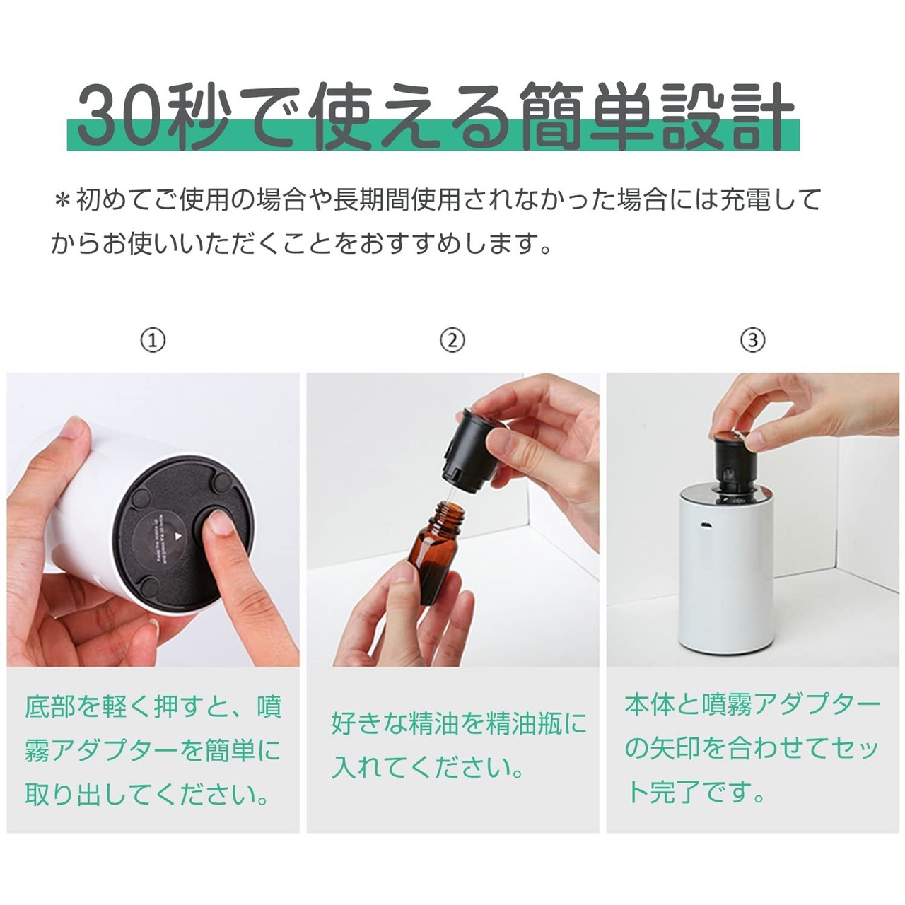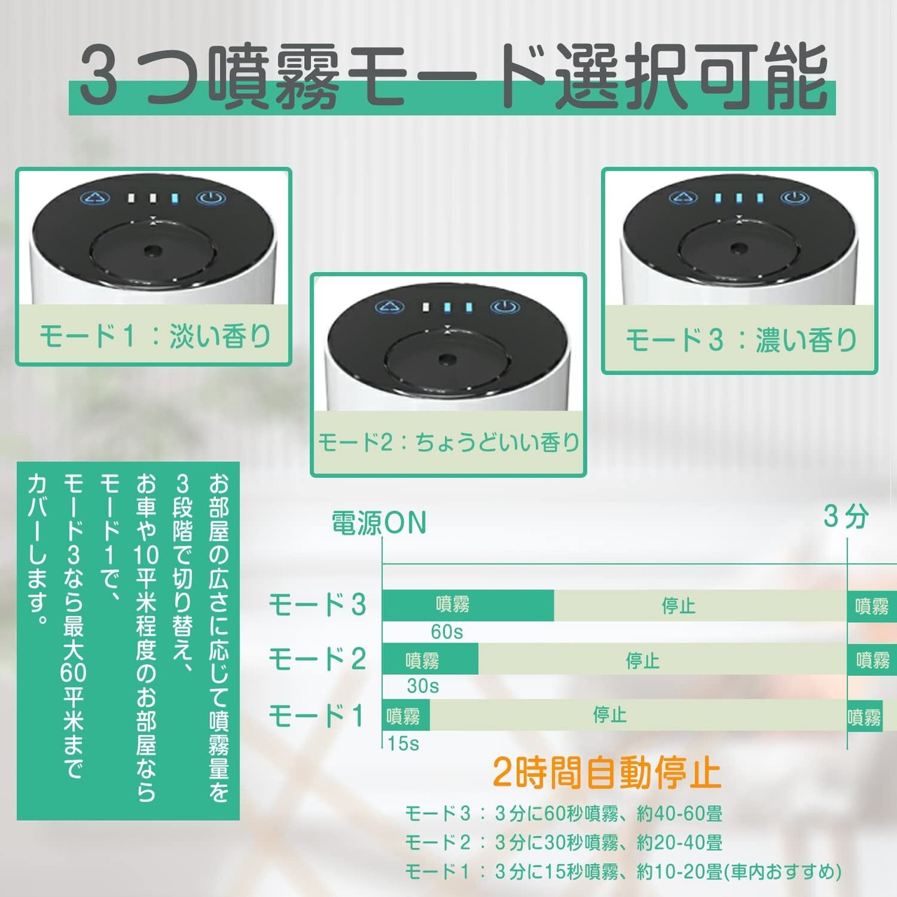 【噴霧量調整可能】アロマディフューザーは3つ(15秒モード、30秒モード、60秒モード)の噴霧モードが持っています。運転2時間後に、自動に電源OFFになります。お部屋の面積やご需要により、噴霧モードを選びましょう!