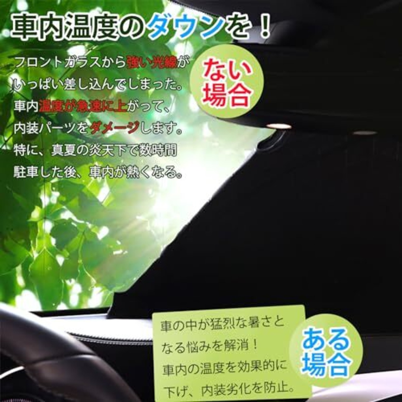 【内装劣化防止】本品はダッシュボードの上部のフロントガラスを覆うという形で使用しておりますので、真夏の炎天下で数時間駐車した後でも、車内の温度を効果的に下げ、内装パーツへのダメージや経年劣化を防ぎます。