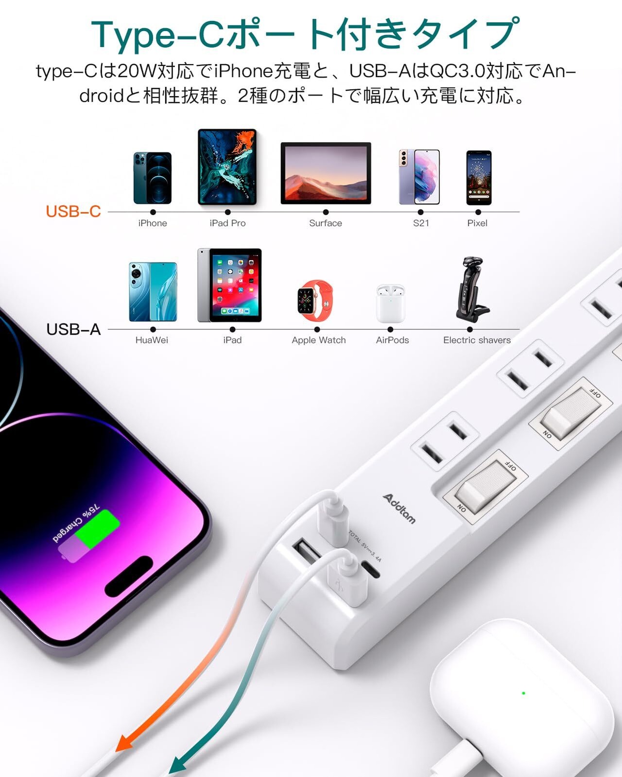 【12-in-1電源タップ&2Type-Cポート】8個AC差込口、2つのUSB-Aポート、2つのUSB-Cを備えた電源タップ。 コンセント間の干渉を防ぐため、前面、側面ともACコンセントが付いています。新販売の携帯電話に対応するために2個typeCポートも特別に追加されており、typeCポートの充電ヘッドを購入する費用を節約できます。USBポート付だからアダプタ不要で、省スペースでスッキリにします。出張、会議室、自宅などで12台デバイスを充電できます。