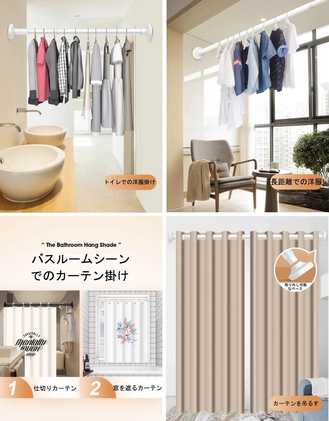 【優れた耐荷重性能】:優れた耐荷重性能を持っています。 当社のつっぱり棒は高品質の厚みのあるステンレス鋼で作られており、湿気の多い環境でも塗装の剥がれ、錆び、曲がり、脱落を維持できます。 同時に、物干し竿の両端のベースには拡大して厚みのある滑り止めベースが使用されており、摩擦が高く、しっかりと安定しています。