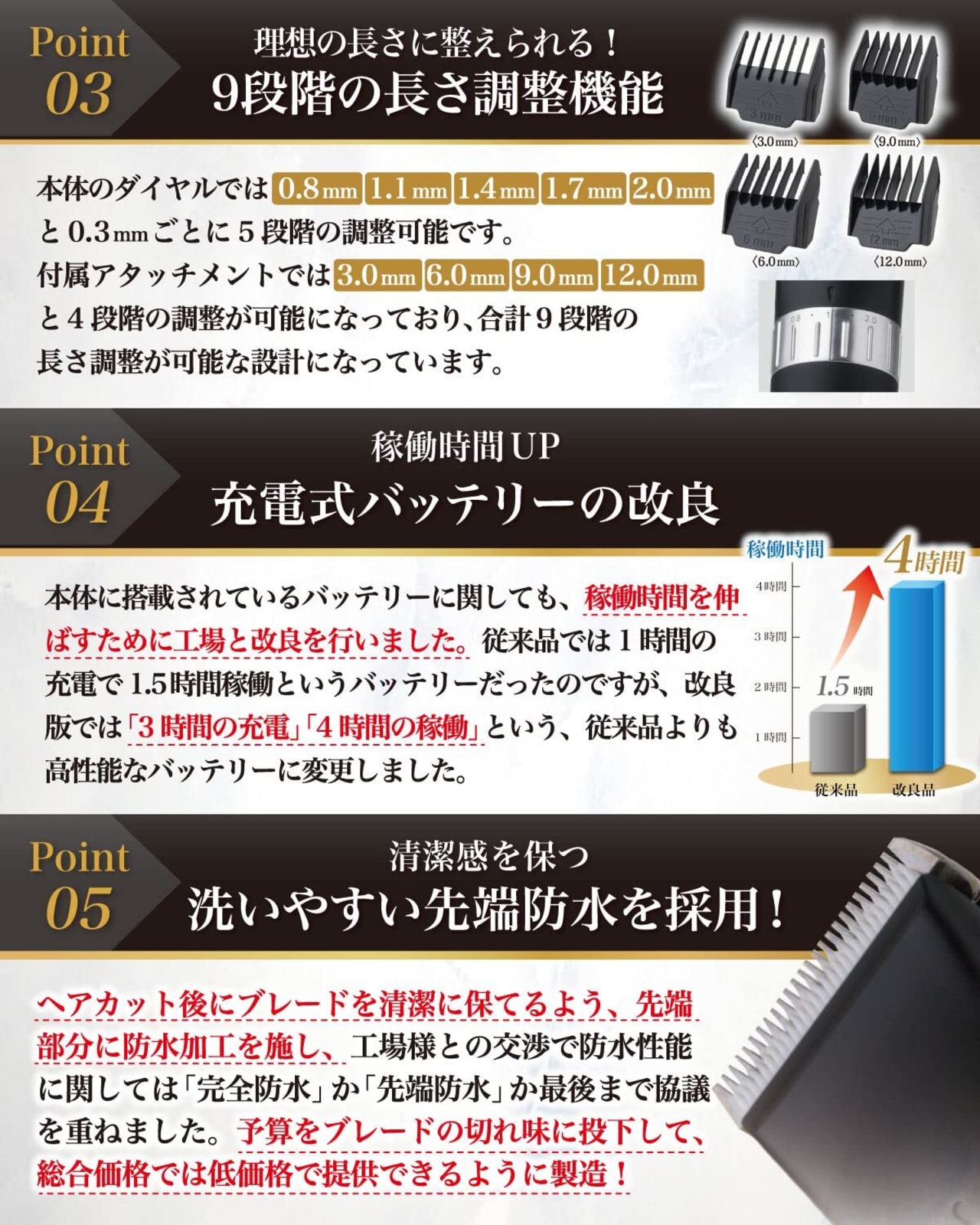 【こだわり本体設計】様々なメーカーから” ヘアカッター”や” ヘアクリッパー ”として 電動 バリカン が販売されていますが、Rozallyの 電動 バリカン は”こだわり”が一味違います。 初心者でも取り扱いやすいよう USB充電 の コードレス 型モデルで製品化をしました。 家庭用ということで 静音 設計の追加と、 水洗い できるように 先端 防水 のブレードを採用して製品化。電動バリカン や ヘアトリマー など 散髪 アイテムをメインに取り扱っている10社以上の工場からサンプルを取り寄せ、長さ調整やビ先端防水など一緒に試行錯誤して頂けた1社に絞って発注を行なっています。理容師の先生には 業務用 と比べても遜色ないと高い評価を頂いております。