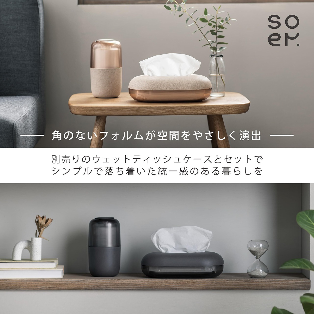 【角のないやさしいフォルム】角のないフォルムは空間をやさしく演出します。別売りのウェットティッシュケースとセットでお使いいただくことで統一感を出し、暮らしの質を高めます。