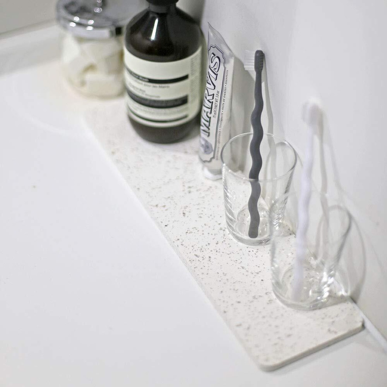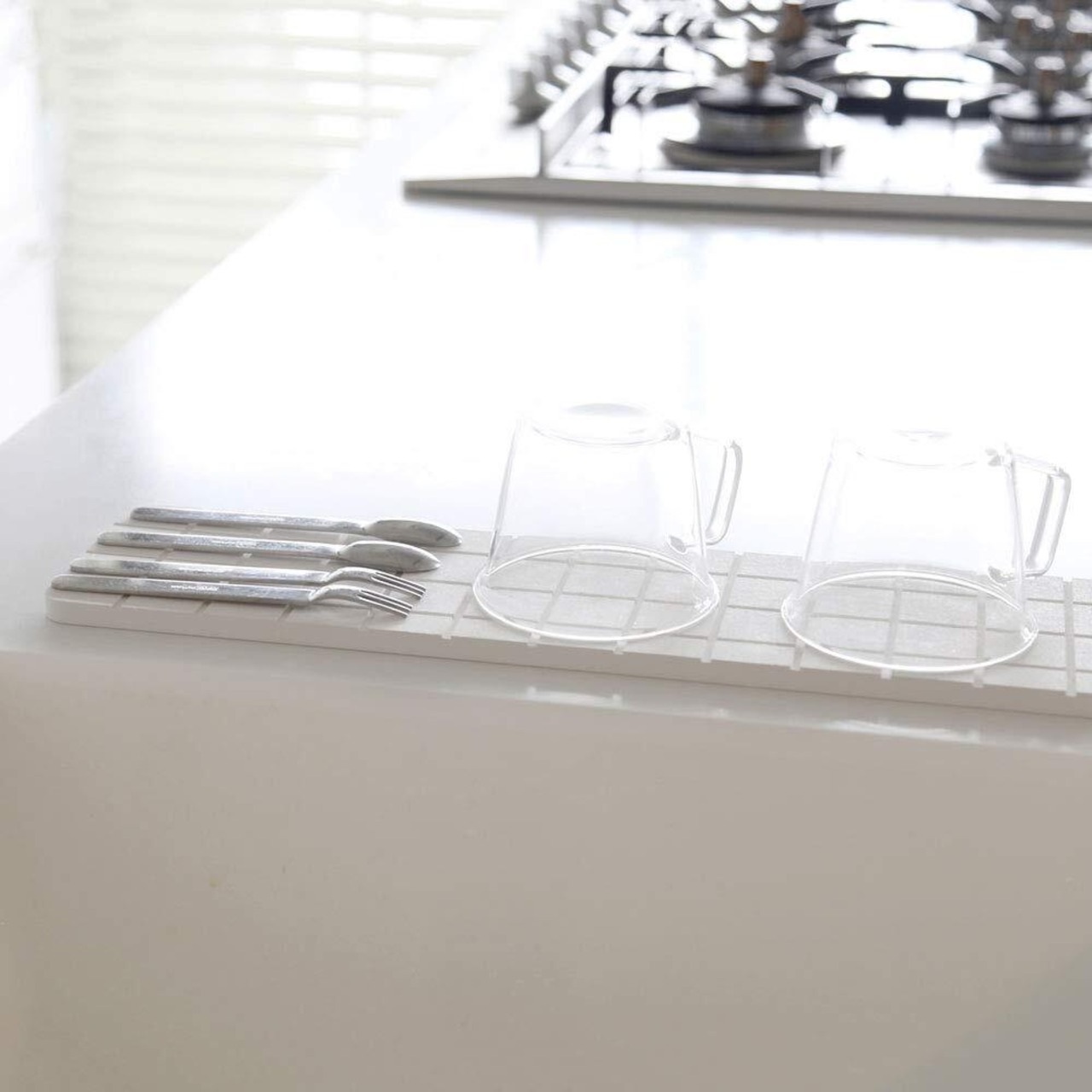 キッチンや洗面台まわりで大活躍のドライトレイに新サイズが登場。家族が増えるともう少し置きたい! という声に応え、置き場所に困らないスリム感はそのままに、ロングサイズになりました。グラスを5つ並べて置くことができ、ちょっとした洗い物にも丁度よいサイズです。