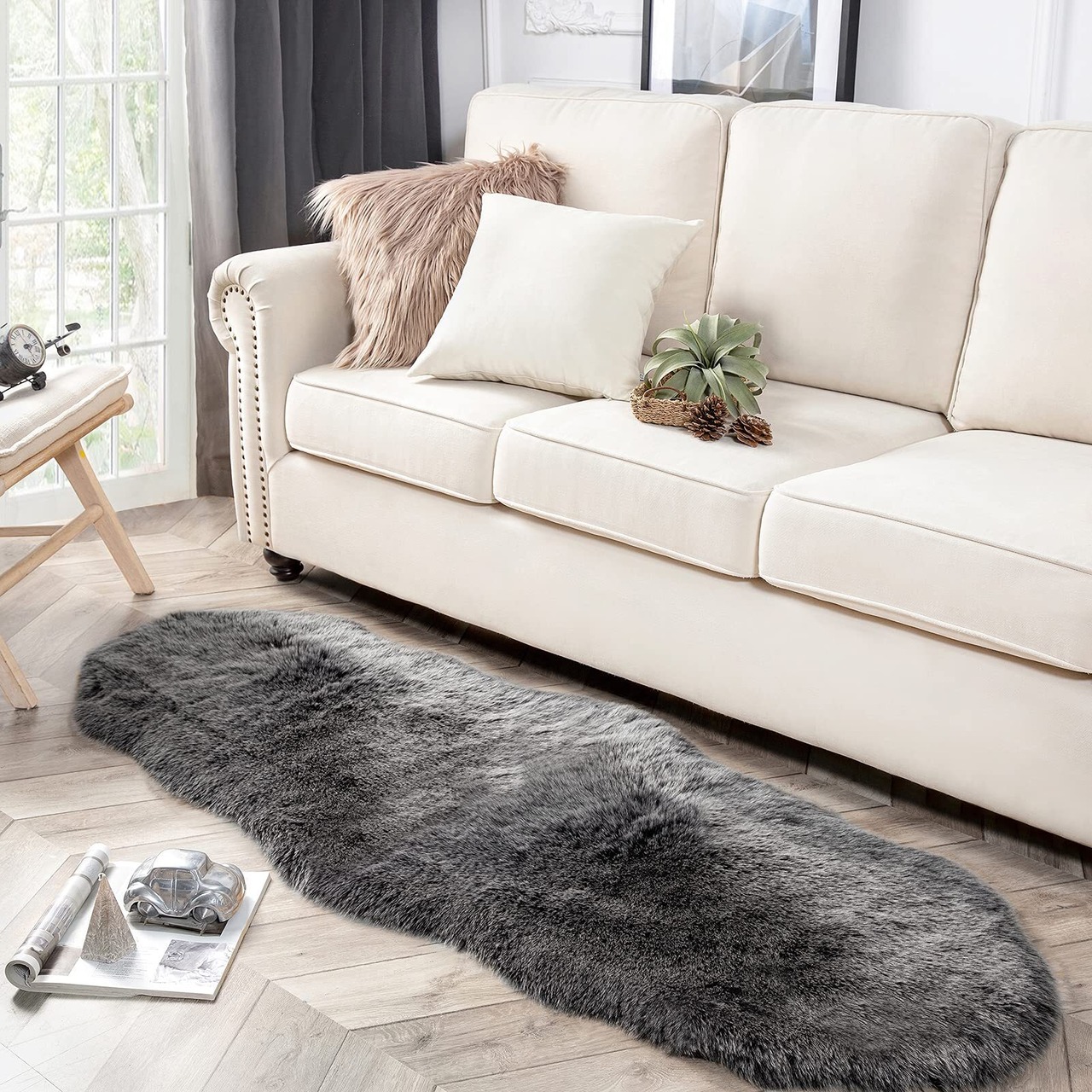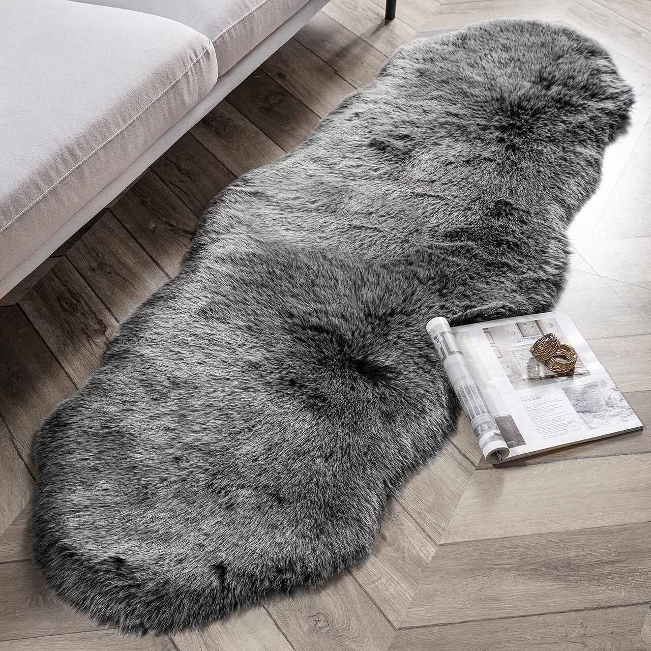 Phantoscope ラグマット カーペット ムートンマット 滑り止め付 柔らかい シープスキン 厚手 極厚毛足約5cm 手触り優しい ふわふわ 折り畳み 洗える 抗菌 防ダニ 北欧 キャンプ 冷房 床暖房対応 60×180cm ホワイティッシュチップ&ブラック