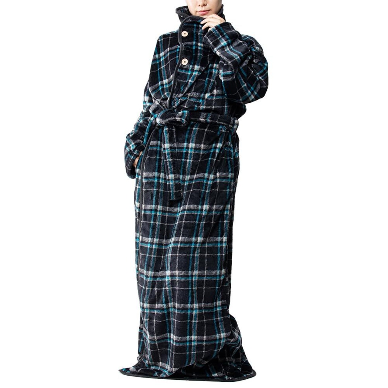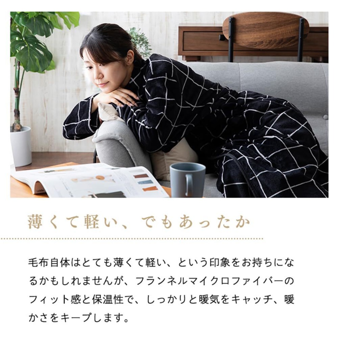 アイリスプラザ fondan 着る毛布 ポケット・ベルト付 特製BOX入り Lサイズ 着丈170cm チェック柄 ブラック×ブルー 静電気防止 洗える フランネルマイクロファイバー 部屋着 クリスマス ギフト ルームウェア