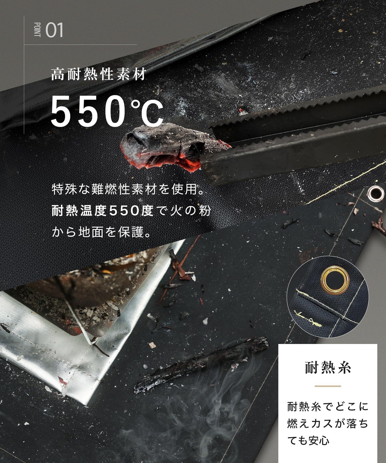 ️ 焚き火やBBQによる飛び火で地面を傷めないのはキャンプの基本マナー。焚き火台やグリル台からの飛び火等による地面の植物や地中の微生物への被害を最小限にするために焚き火シートをお使いください。 ️ たき火時の専用シートとして開発され、耐熱温度約550℃で熱に強く、焚き火台から落ちる火の粉や燃えかすがこぼれた時に地面や芝、ウッドデッキ等のダメージを軽減する焚き火シートです。地面を焦がさず環境に配慮しながら焚き火をお楽しみください!️ スタイリッシュなオールブラック色。️ 軽量で折りたためるので持ち運び時も便利な焚き火台シートです。ソロから2~3人のキャンプ向けアイテム。