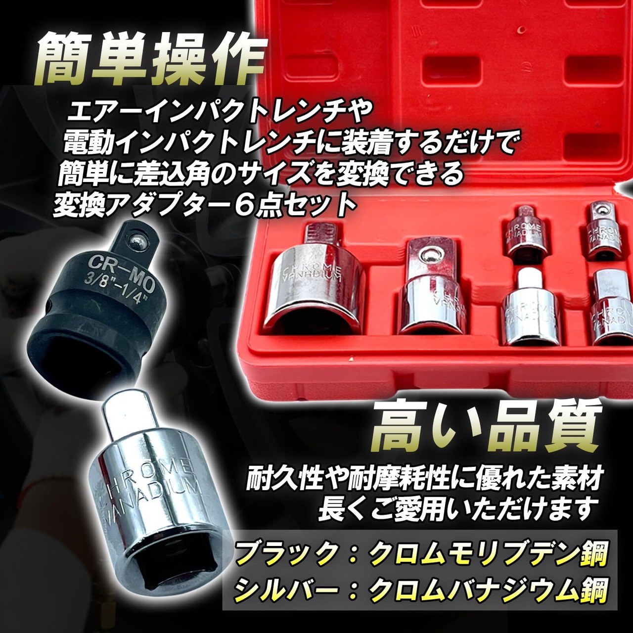 TIGRE BLANC ソケット 変換 アダプター 差込角 インパクト レンチ 対応 クロムモリブデン 1/4 3/8 1/2 3/4 インチ 6点 セット 黒 ブラック