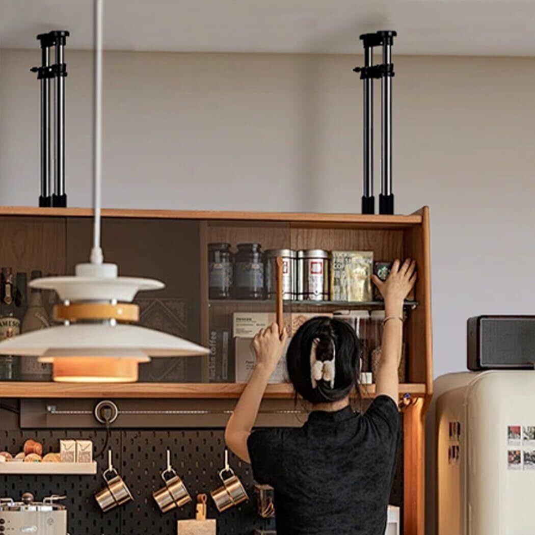 ダブルH型構造とジャッキ方式で、家具と天井をしっかりと固定します。5㎝ブロックがあり、様々な幅範囲に対応できます。