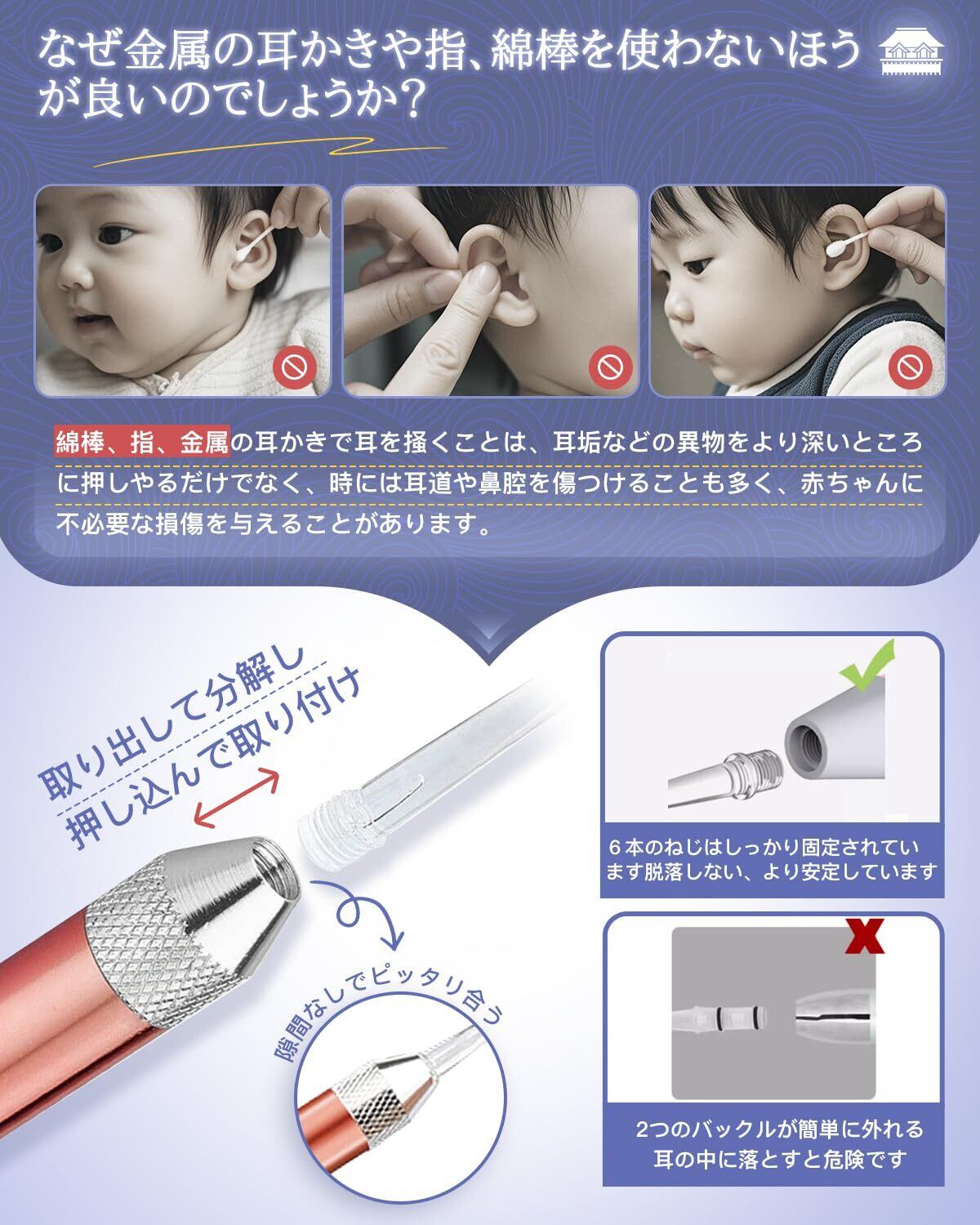 【耳かき】: LEDライトで耳内部を確認しながら掃除可能。大人用と子供用でサイズが異なるため、大小1つずつの耳かきパーツを同梱。