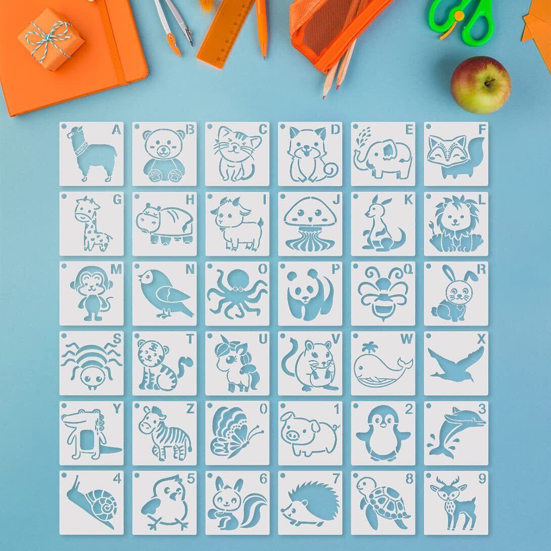 Koonafy テンプレート 36枚 動物形 ステンシルシート パンダ 猫 かわいい プレート 絵画 文具 プレゼント DIY 手作り デザイン 製図 ステンシル タコ 羊 ハムスター 熊 フォックス 獅子 ペンギン 猿 蝶々 鷹 子豚 ワニ (動物形36種)