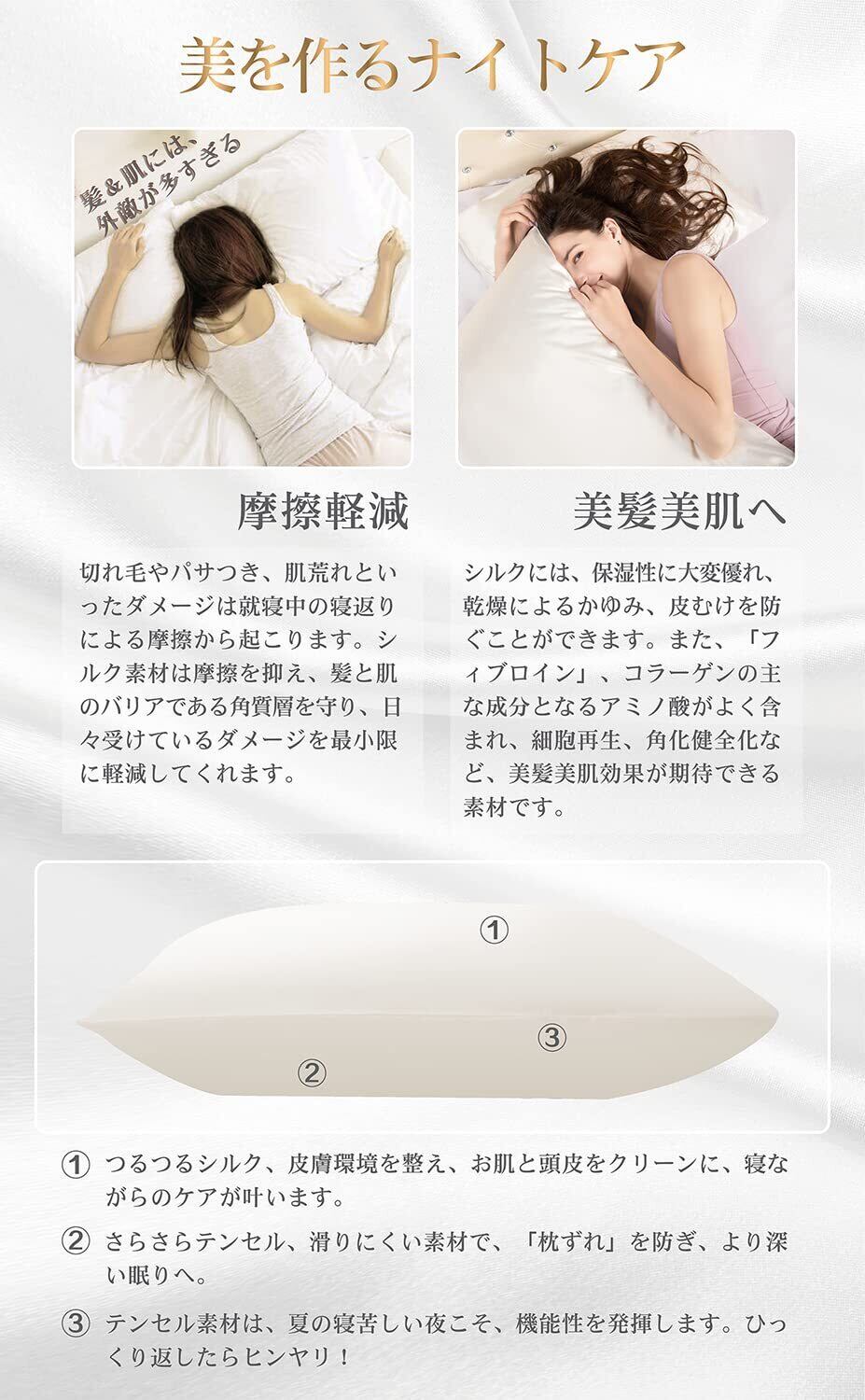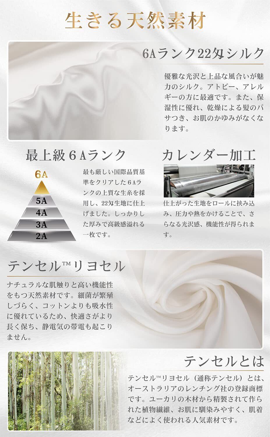 【天然繊維へのこだわり】古くから愛用されていたシルク素材、格調高雅な風合いと光沢が人々を魅了します。その中でもっとも希少な6Aクラス生糸を厳選しております。さらに、厚手の22匁生地を使用し、滑らかな肌触りとドレープ感をお楽しみいただけます。また、独自のカレンダー加工により、さらなる密度とつややかさをプラスします。シルク繊維は皮膚に最も近い成分でできているため、お肌と髪を守る最高の素材です。裏面のテンセル(リヨセル)生地は天然木材から作られた素材です。シルクと同じく肌に優しく上品な風合いで人気を博しています。肌に刺激を与えることがほとんどなく、お肌が弱い方にも安心してお使いいただけます。機能性が満点な二種類生地で絶妙なハーモニーがうまれ、触れるたび心も身体も癒してくれます。