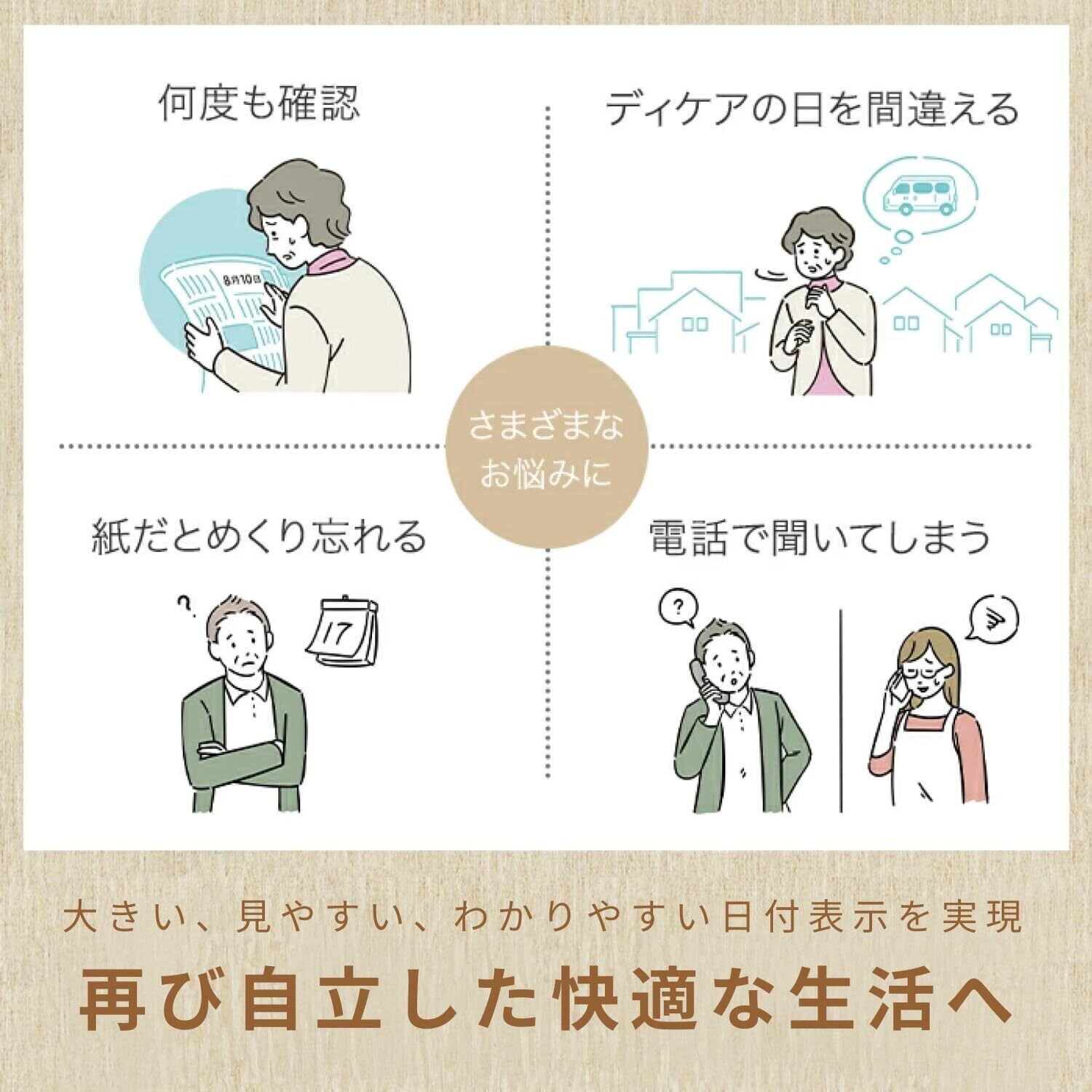 従来品は一つの画面でいろんなことが確認でき、便利ですがわかりにくい・見にくいという方もいらっしゃいました。メガ曜日電波日めくりカレンダーは曜日・日付に絞り、表示をシンプルに整理することで「いま何日?何曜日?」対策に特化しています。