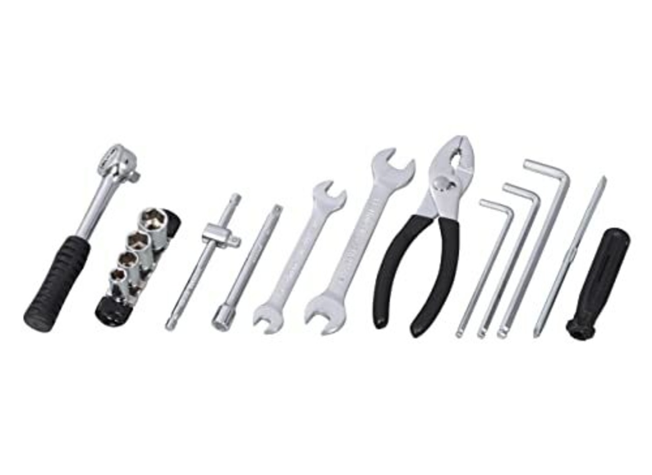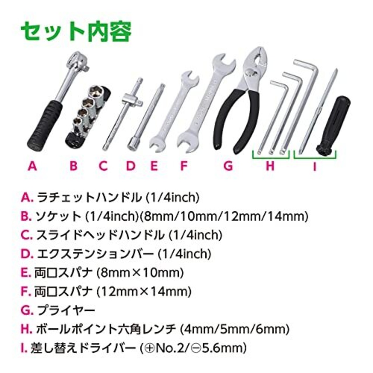 セット内容 ラチェットハンドル(1/4インチ) | ソケット(1/4インチ) 8mm/10mm/12mm/14mm | スライドヘッドハンドル(1/4インチ) | エクステンションバー(1/4インチ) | 両口スパナ(8mm×10mm) | 両口スパナ(12mm×14mm) | プライヤー | ボールポイント六角レンチ(4mm/5mm/6mm) | 差し替えドライバー(⊕No.2/⊖5.6mm)