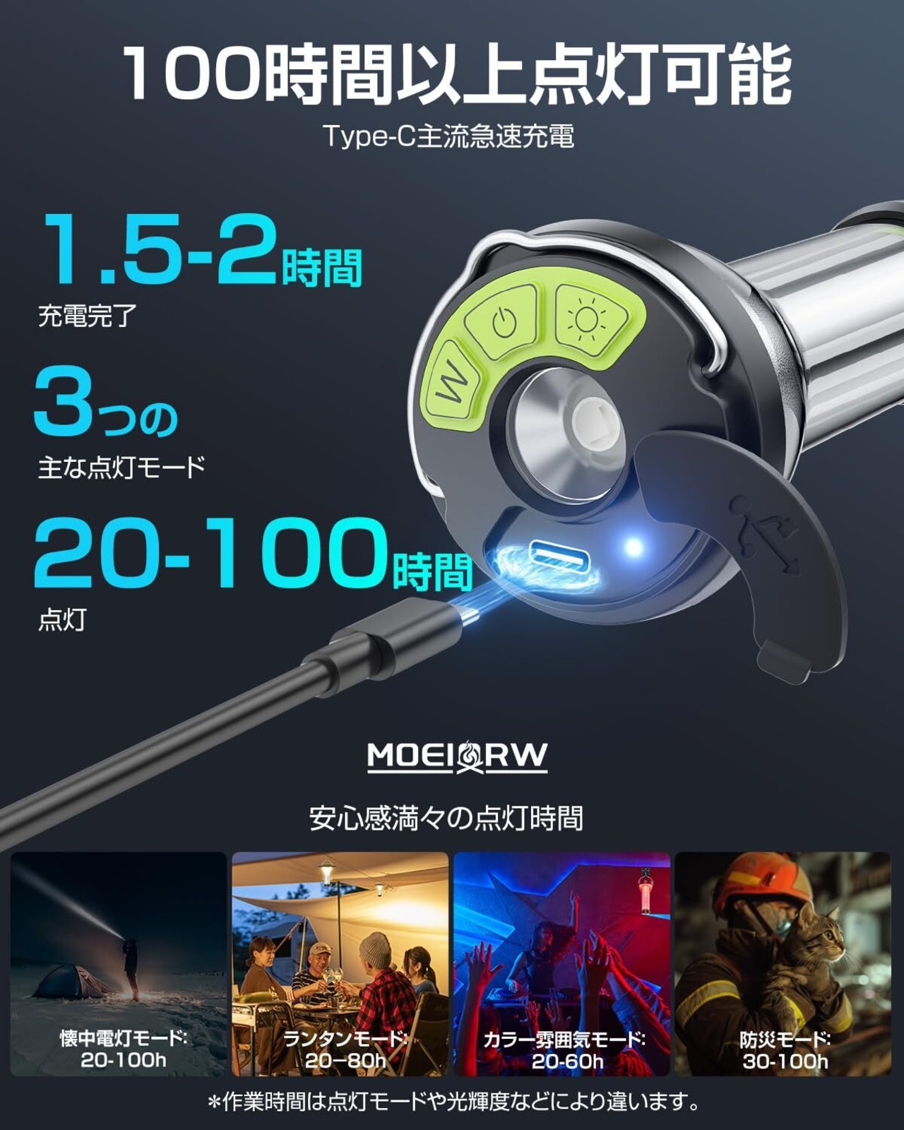 【2024年新発売・防災・キャンプ、多役ライト】元々キャンプ用とした多モードライトがよく好評された。でも、弊社は自慢していない、いつ起こるか分からないニッポンの自然災害に対して、このライトはまだ何ができるのかを考えております。この度は地震・停電・台風など災害あって非常時に防災対策の多役ライトが新登場!驚いたな3200mAh超大きな電池容量、約100時間連続照明でき、電池が切れたことは心配ありません。最新なtypeーCポートを搭載し、高速充電や繰り返し利用が可能になる。製品本体は高強度素材を使用したうえで、一体化の構造における台風・震災等非常時の際にも心置きなくご利用頂けます。115mm手のひらぐらいサイズ、軽くて小さいです。IP55レベルの防滴や防塵が満たし、一般的な雨やほこりから保護し、複雑の変化する環境に対処します。