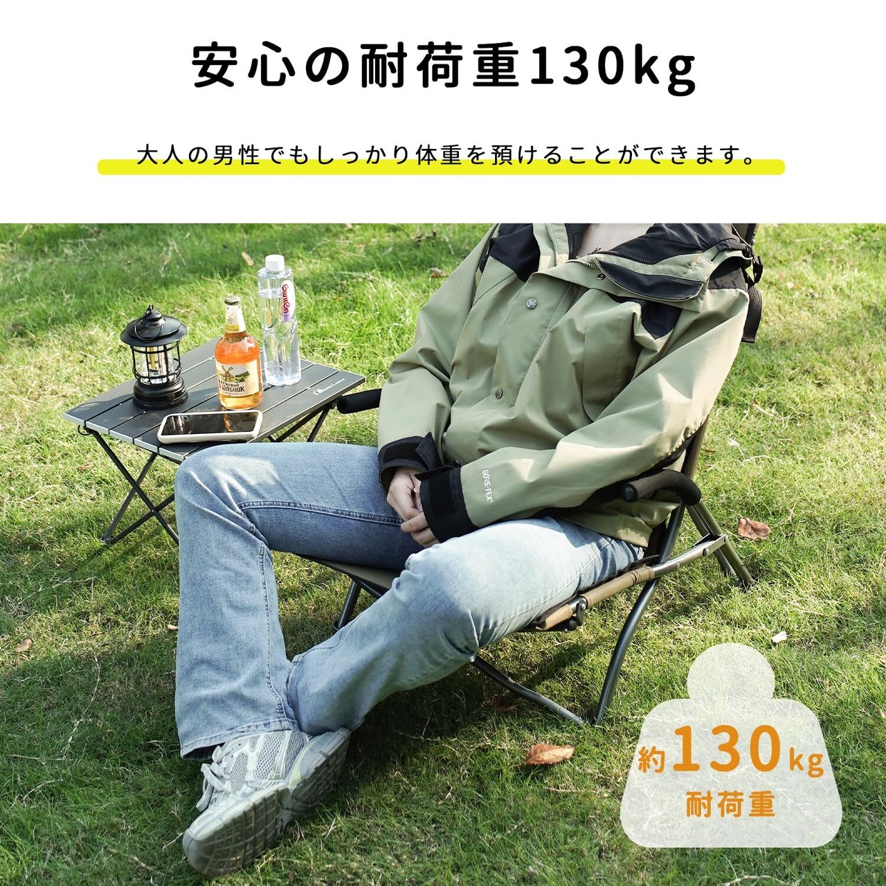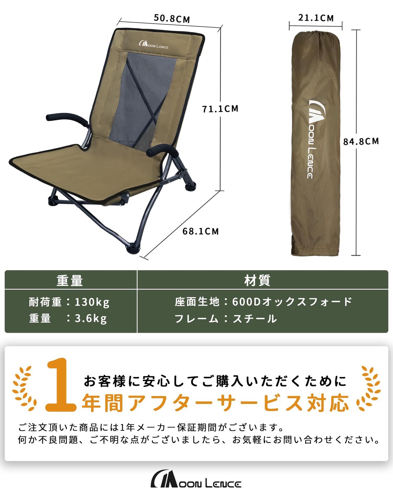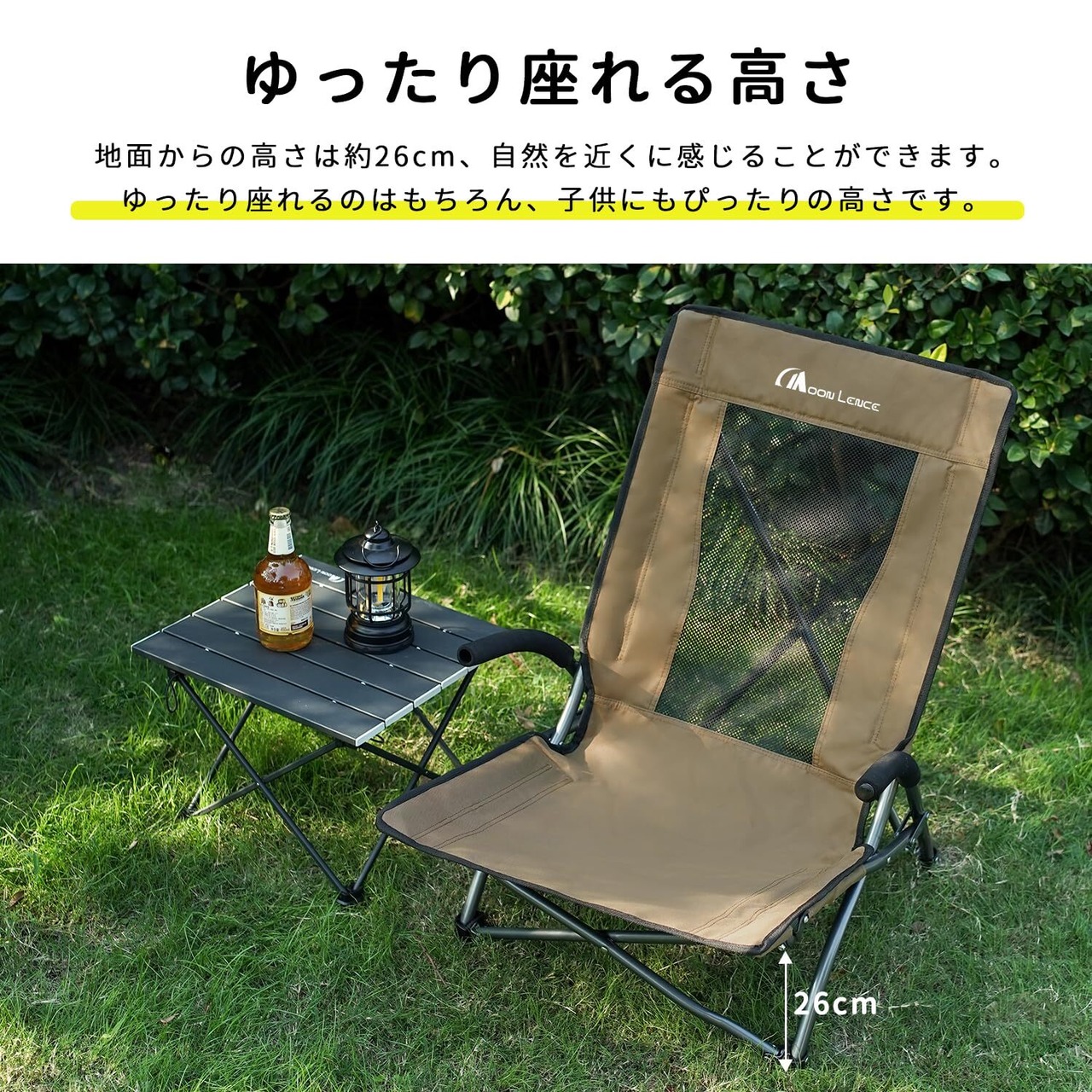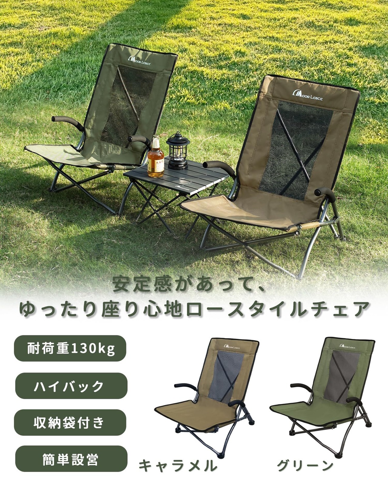 MOON LENCE アウトドア チェア ローチェア ハイバック 耐荷重130kg キャンプ 椅子 折りたたみ あぐら 簡単設置 座椅子 ロースタイル お釣り 登山 フィールド 運動会 収納袋付き キャラメル STY001
