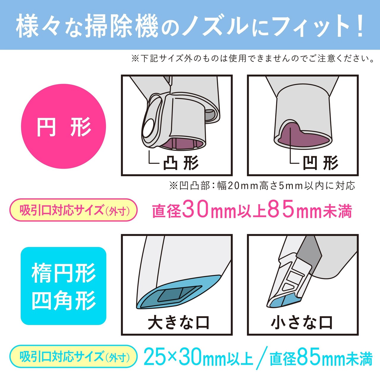 吸引口サイズ対応範囲<外寸>直径85mm未満、円形:直径30mm以上、楕円形・四角形:25×30mm以上 上記サイズ外のものは使用できません。