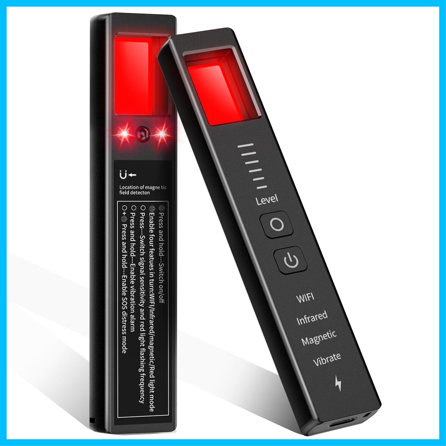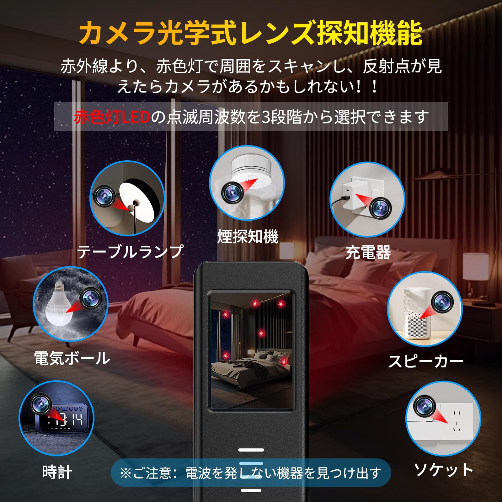 【高精度なカメラ探知機能】当盗聴器発見機は、盗撮カメラ発見器としても秀でた性能を発揮します。カメラ光学式レンズ探知機能を搭載し、赤外線で赤色灯が周囲をスキャンし、赤色灯 LED の点滅周波数を 3 段階で調整可能です。テーブルランプ、充電器、時計、ソケットなど、日常用品の中に隠された盗撮カメラを検出します。ビジネスシーンでの情報漏えい防止にも役立ち、機密情報を保護するための重要なツールとなります。