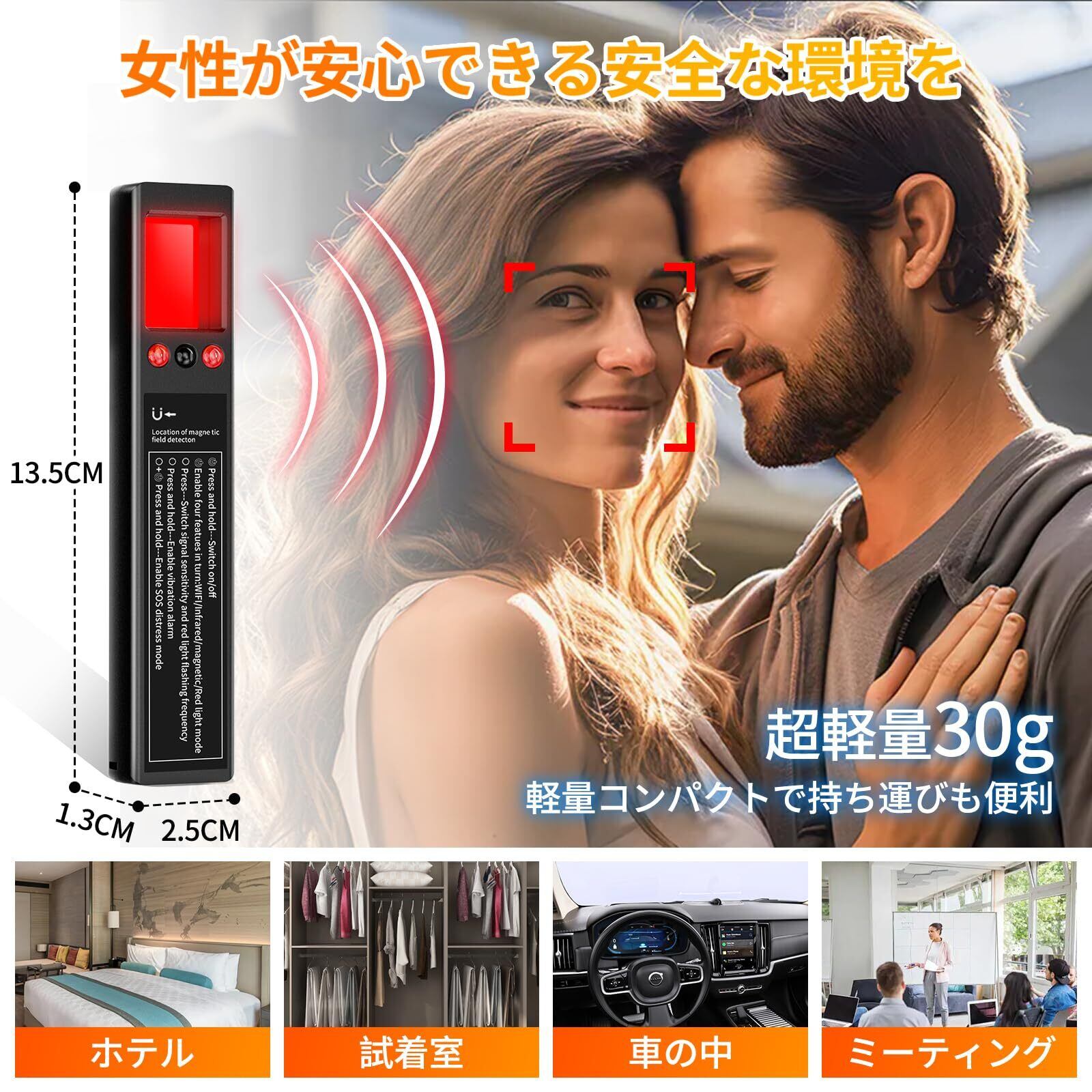 【多様な用途と信頼できるサポート】このプライバシー保護機器は、多様な用途に対応しています。ホテルや試着室、車の中、会議室など、様々な場所で使用できます。女性が安心できる安全な環境を提供するためにも最適です。万一の不具合にも迅速な対応を行い、1年間のメーカー保証が付いております。