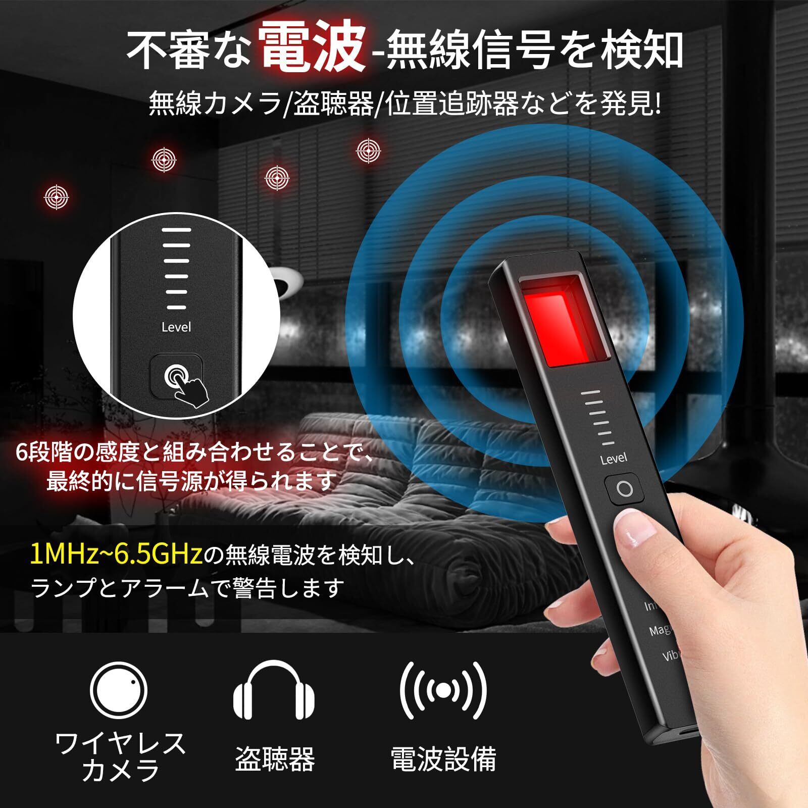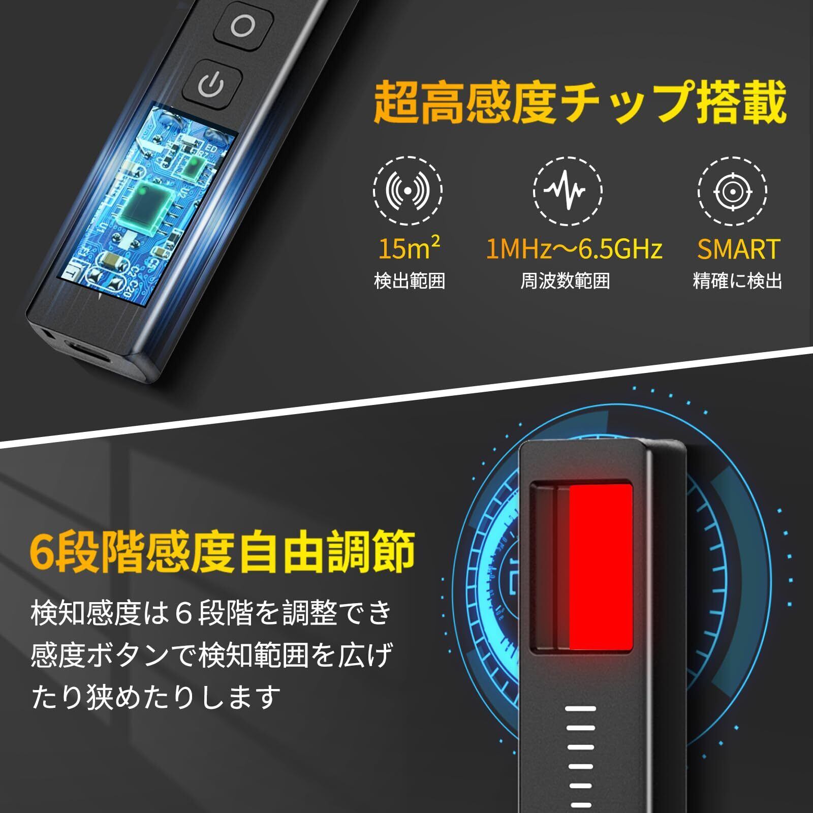 【使いやすい&高感度】この盗撮カメラ 発見器は、超高感度チップを搭載しており、15m²の検出範囲と1MHz - 6.5GHzの周波数範囲で正確に検出します。6段階の感度を自由に調節でき、感度ボタンで検知範囲を広げたり狭めたりすることができます。操作はシンプルで、初心者でもすぐに使いこなせます。微弱な信号や磁場も捉えることができ、確実なプライバシー保護を実現します。