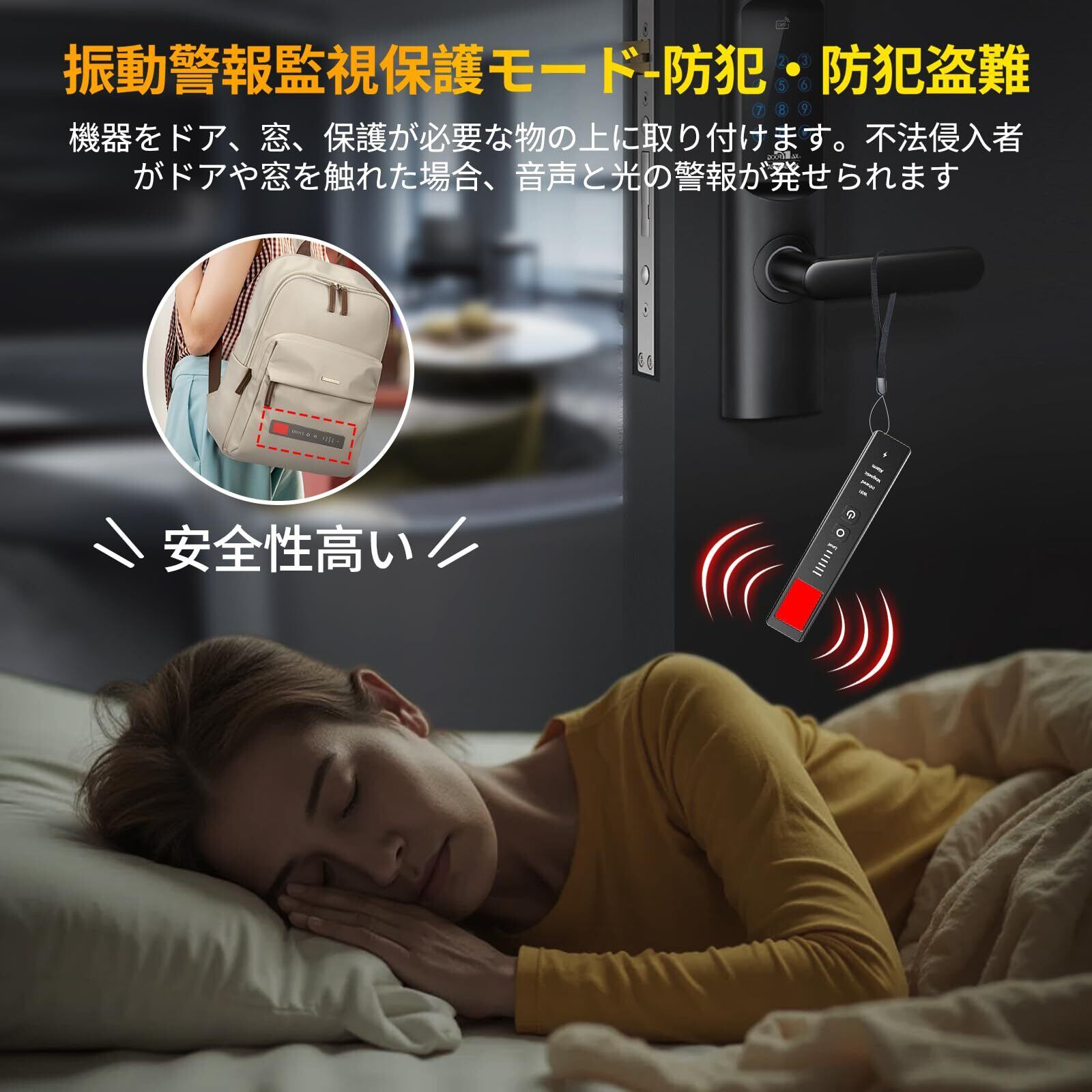 【防犯・防犯盗難に役立つ&小型で軽量】振動警報監視保護モードは、防犯・防犯盗難に大きく貢献します。ドアや窓、大切な物の上にこの機器を取り付けると、不法侵入者がそれらを触れた瞬間、音声と光の警報が同時に発せられます。小型軽量で、旅行や出張先でも使いやすく、ホテルや自宅など様々な場所で安全を守ります。特に、女性や治安不安定地域の生活者にとって、安全確保に有効です。
