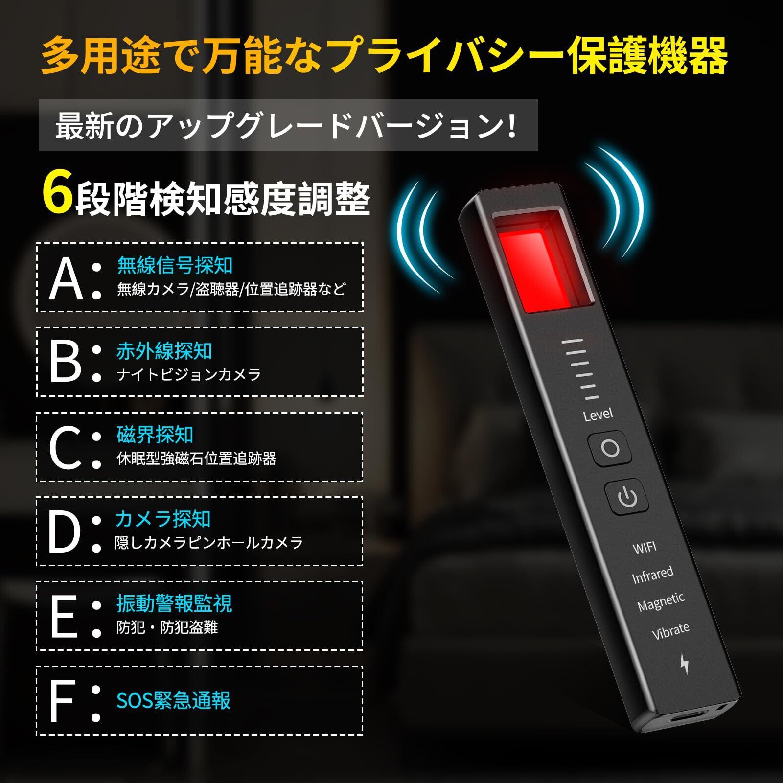盗聴器発見機【2025革新&振動警報/SOS通報追加】盗聴器発見器 盗撮カメラ 検出器 GPS追跡装置探知機 RF無線スキャナー カメラ探知機 隠しカメラ防止対策 盗聴チェッカー 信号探知機 6つのモード 6段階感度 磁界探知 振動警報監視 高感度 高性能 簡単操作 30g軽量 女性/護身/プライバシー保護/車/部屋/浴室/ホテル/オフィス/家庭/旅行用 日本語取扱書 ブラック
