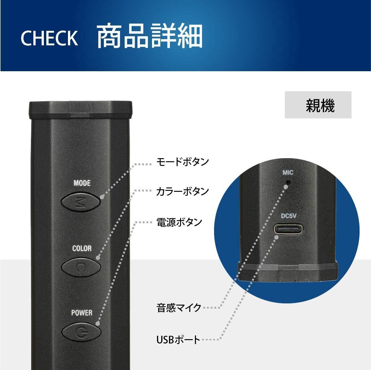 【 仕 様 】 ◆電源:DC5V 2A(USB給電 USB Type-C端子) ◆LED:φ5.5mmLED×30個(ライトバー1本あたり) ◆点灯モード:8モード 20カラーバリエーション(本体内蔵プリセット) ◆内蔵マイク:全指向性コンデンサー型 ◆マイク感度:-40dB ◆Bluetooth:Bluetooth標準規格 Ver.5.2 ◆外径寸法:(約)幅32×高さ320×奥行32mm(ライトバー1本あたり) ◆質量:約365g(ホルダースタンド含む)